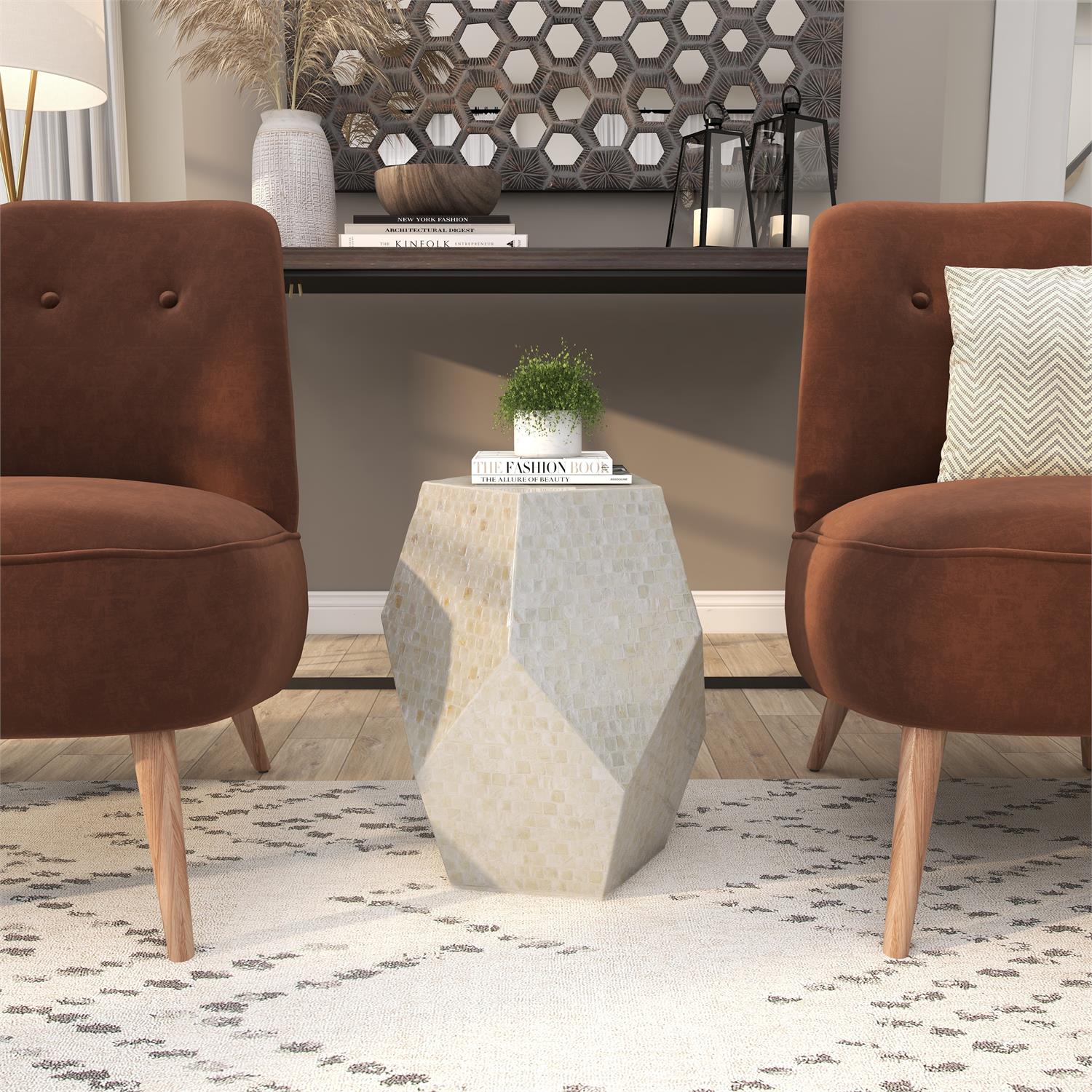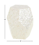 Embrace artistic expression with this Cream Mother of Pearl Shell Handmade Side End Accent Table, a stunning blend of modern elegance and coastal sophistication. Crafted with an MDF core structure and intricate mother of pearl inlays, this hexagonal accent table exudes contemporary charm. The faceted geometric design, enhanced by a polished multi-toned cream finish, makes it a striking statement piece for any living room, bedroom, or entryway.