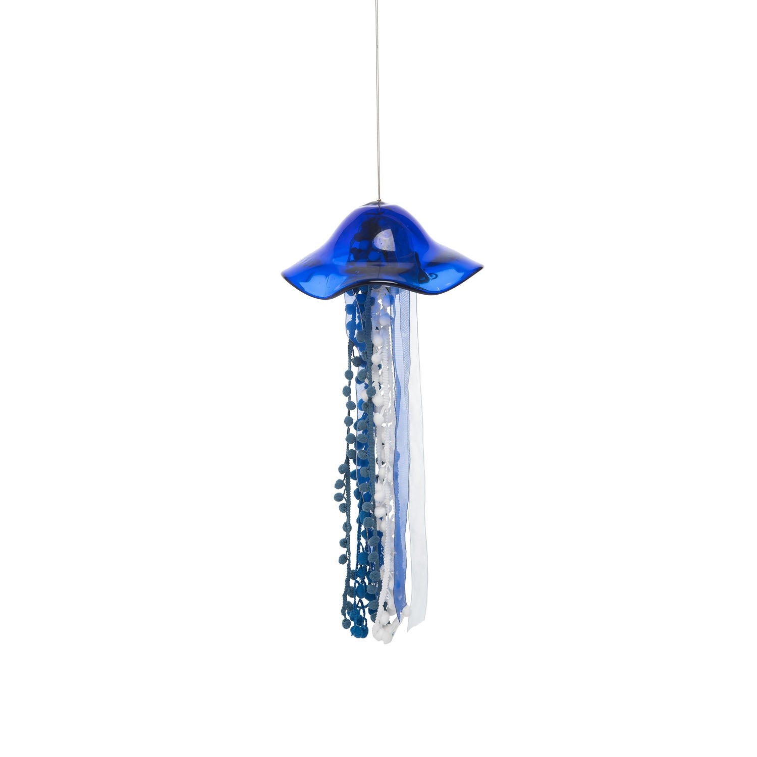 Brighten your space with this charming hand-blown glass jellyfish suncatcher. Adorned with delicate ribbon and pom-pom trim, it adds a whimsical touch to any window, casting enchanting light patterns throughout the room.