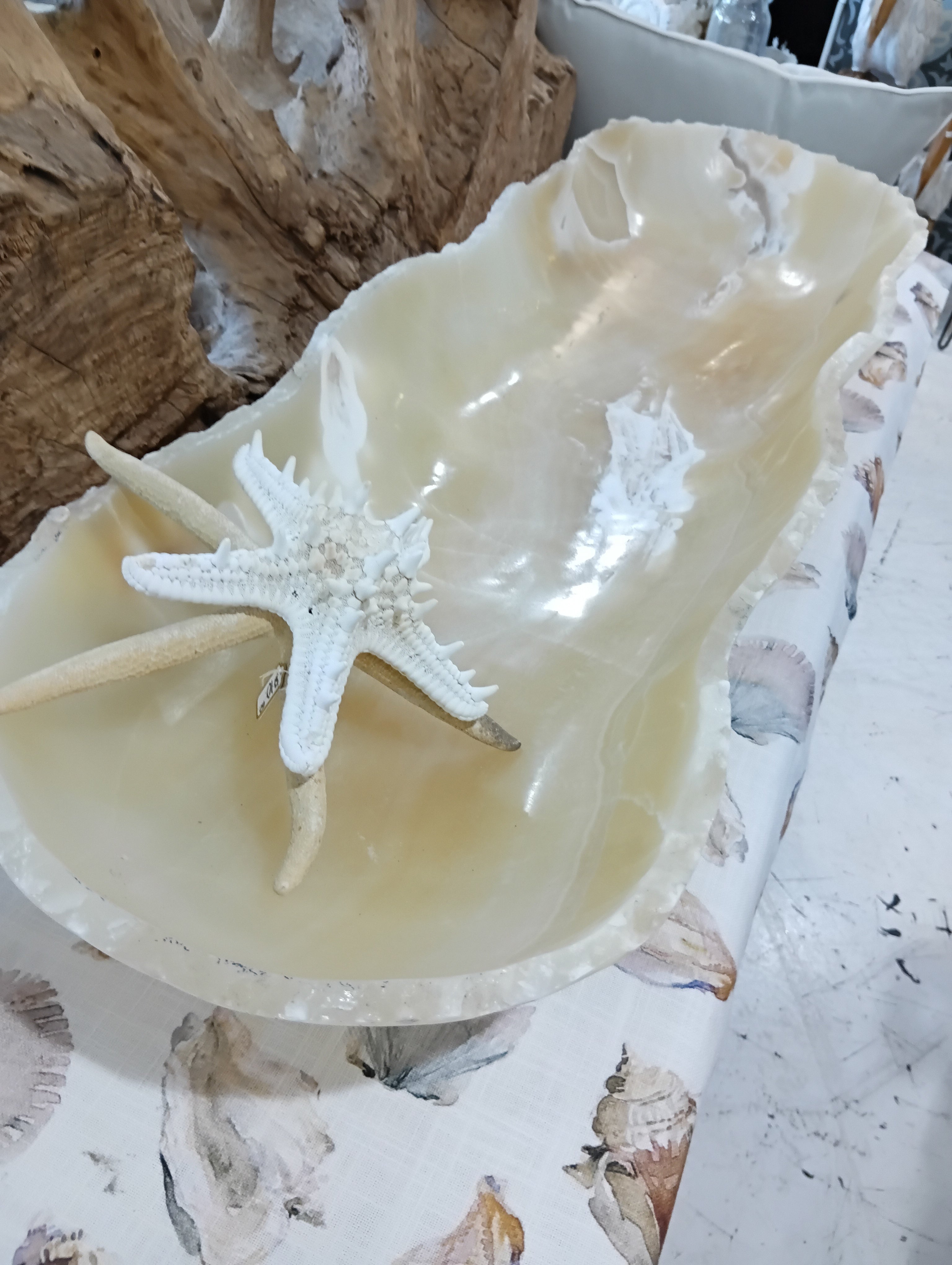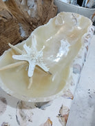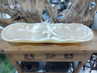 Elevate your interior décor with this exquisite hand-carved Honey Onyx Bowl, a statement piece that radiates natural luxury and timeless elegance. Measuring an impressive 34" in length, this one-of-a-kind onyx vessel showcases soft amber tones and translucent veining unique to this prized stone. Perfect as a dramatic table centerpiece, a coastal-inspired catchall, or a sculptural accent in any refined setting, this substantial piece invites both visual and tactile admiration.