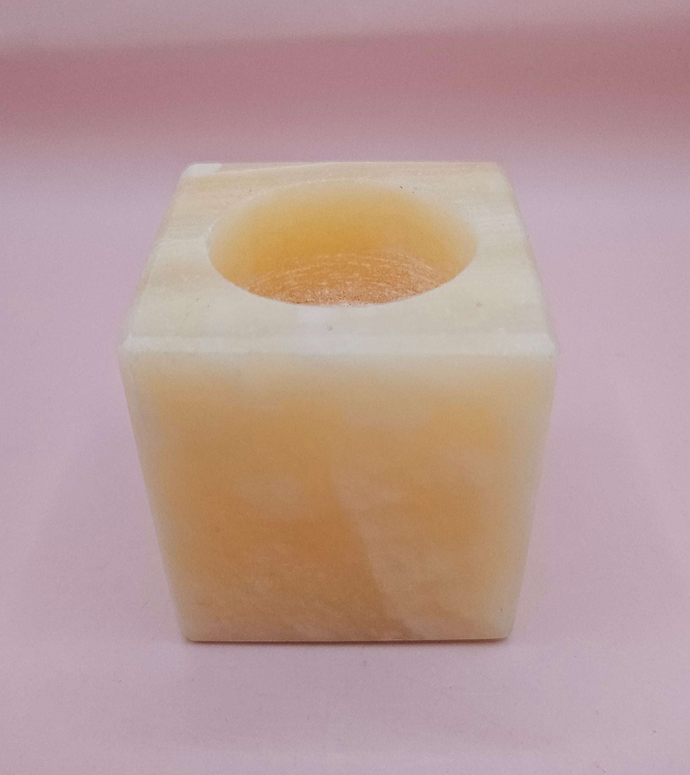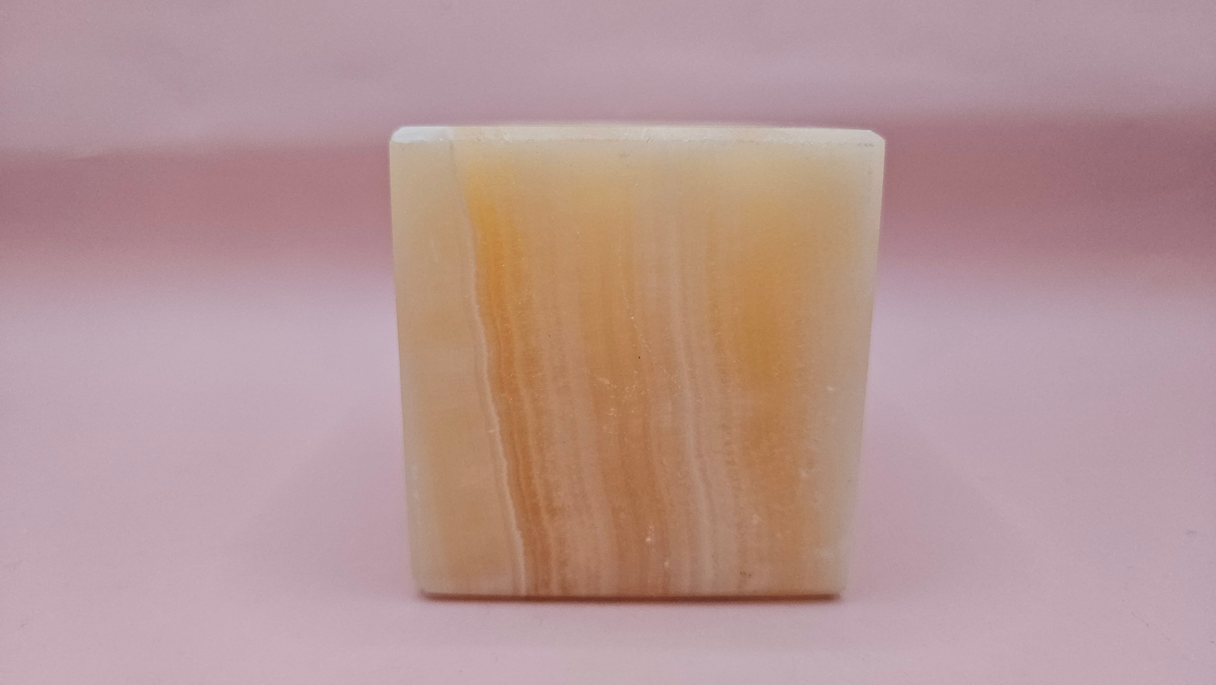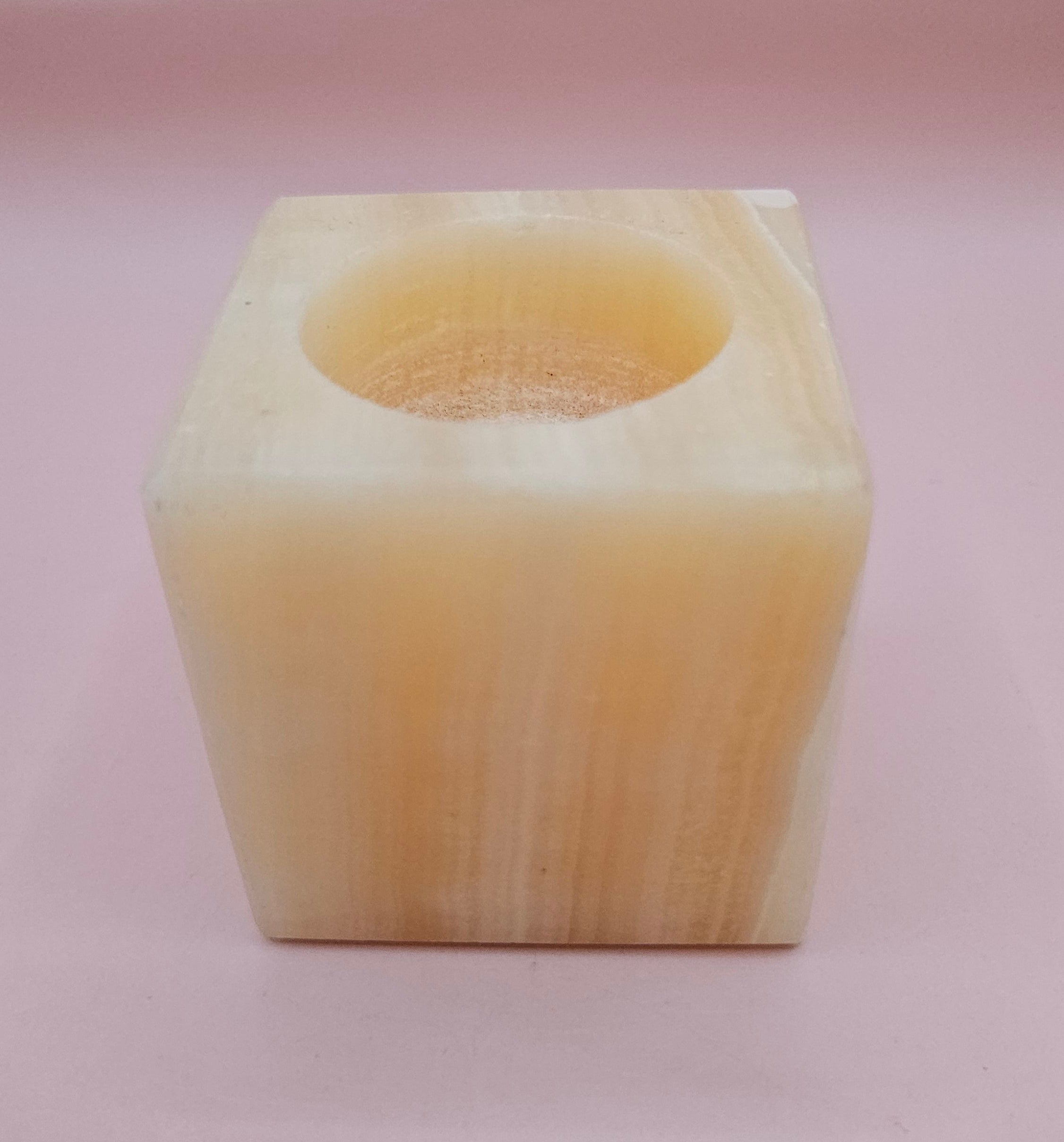 Carved from genuine onyx stone, this square candle holder adds a warm, natural touch to your decor. The translucent layers of golden-beige tones create a soft glow when a tealight is lit inside. Compact and elegant, it's perfect for cozy accents or spa-like ambiance.