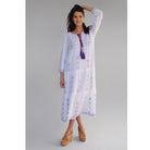 The Cara dress is simply an epitome of beauty in simplicity with its perfectly embroidered dress made completely out of cotton. It is available in a natural white color with beautiful purple colored designs on it. This dress has got a v neck opening which has a string attached with pom poms to tie it. The long sleeves and the length that drops below the knees both suit to its bohemian style and adds on to its looks. Available in colors: Natural