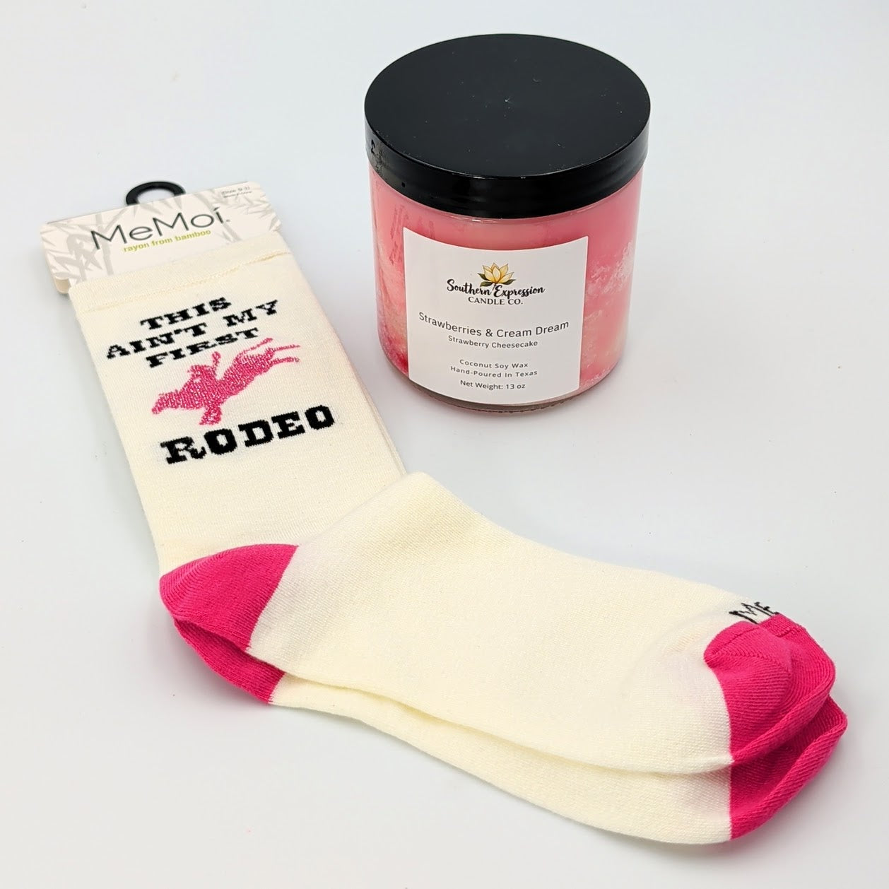 Treat the modern cowgirl to a well-deserved moment of Southern serenity with the Pink Rodeo Relaxation Kit. This hand-curated gift set blends playful Texas spirit with premium comfort, featuring ultra-soft MeMoi bamboo-blend socks emblazoned with a vibrant "This Ain’t My First Rodeo" motif and a hand-poured Strawberries & Cream artisan candle from Southern Expression Candle Co. Perfectly balancing sweet Texas charm with high-end relaxation, it’s an ideal choice for the woman who handles life with style, grit, and a love for local Texas-made quality.