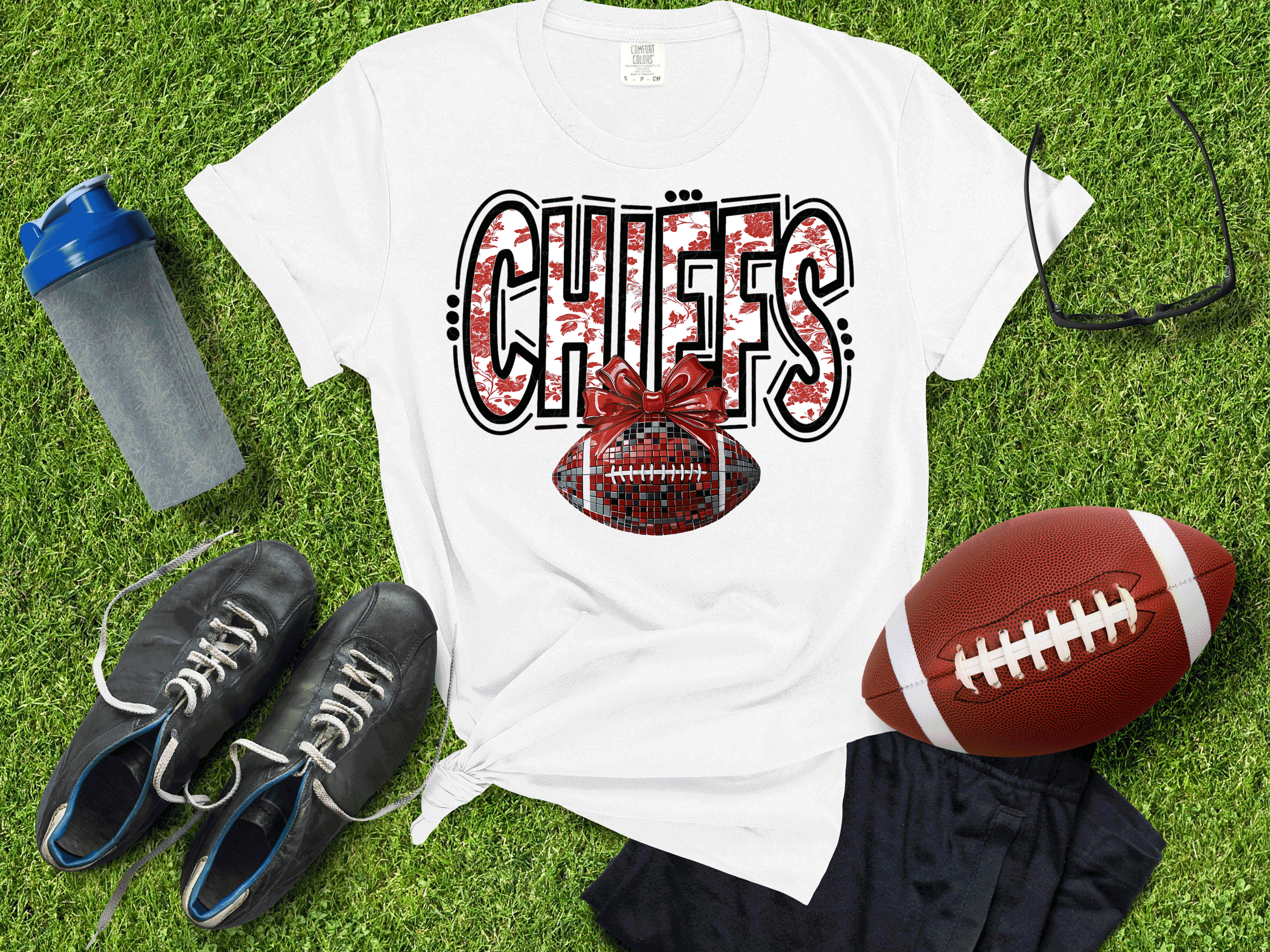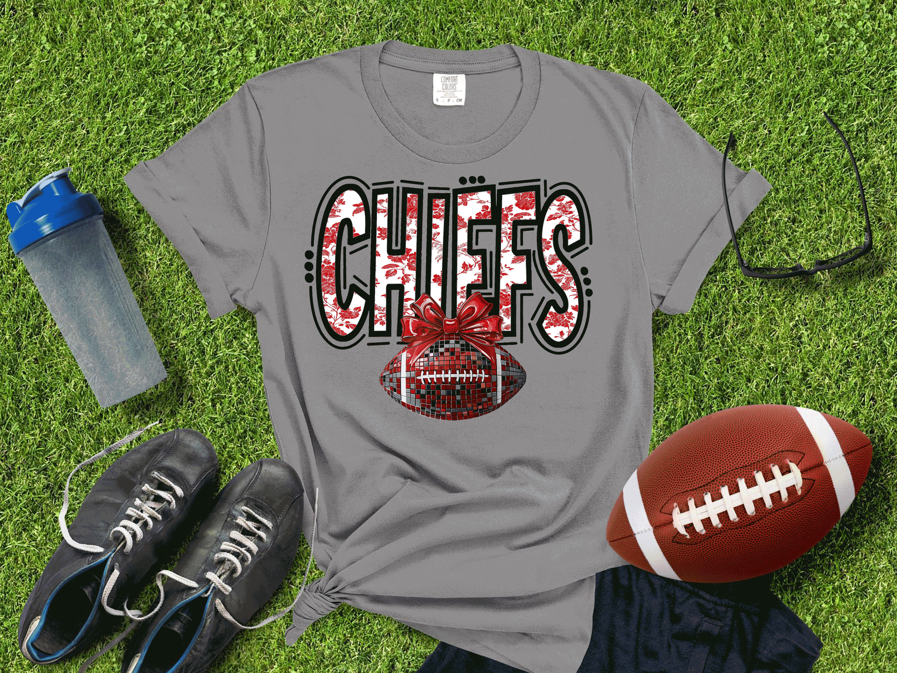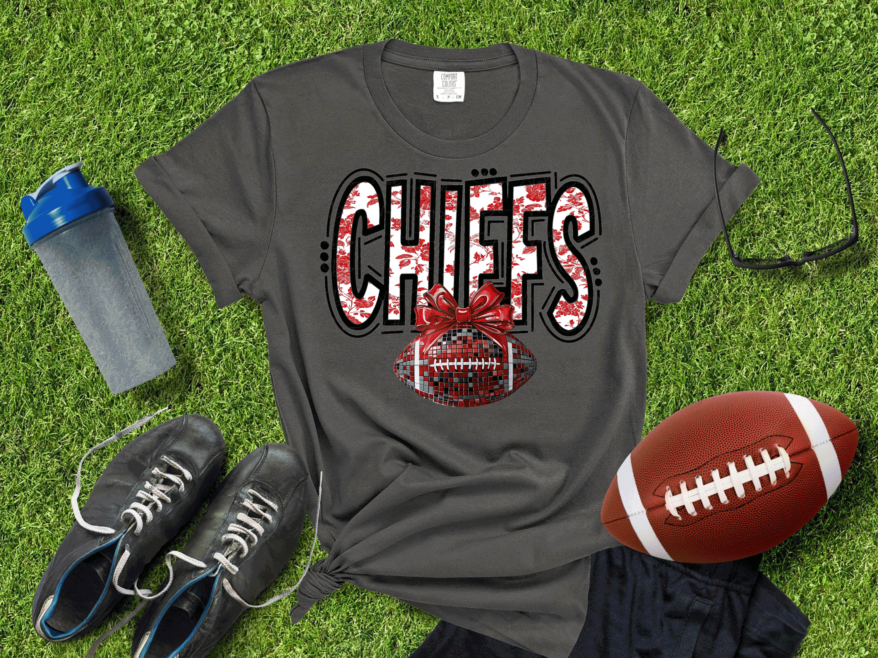 Show off your Kansas City pride in style with our Kansas City Football Metallic Shirt! Featuring a bold faux glitter football design and a trendy coquette-inspired bow, this shirt is the perfect blend of sporty and sweet. Made with premium materials and high-shine metallic accents, it's ideal for game day, tailgates, or repping your team any day of the week. Shine bright and cheer louder — KC never looked so good!