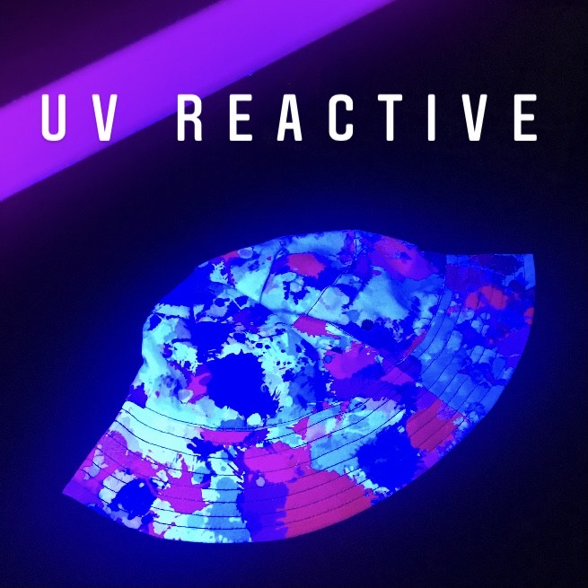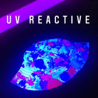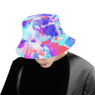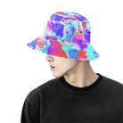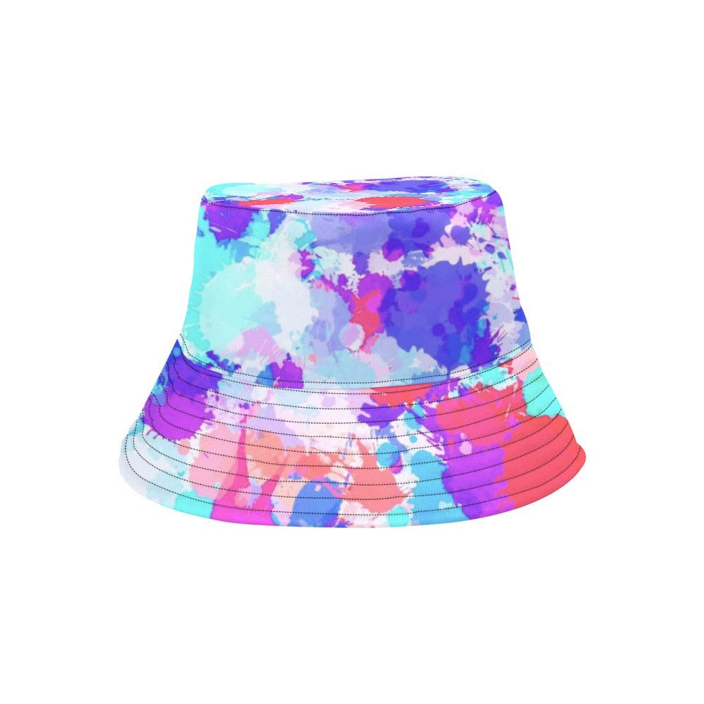 Streetwear inspired white, turquoise, pink, purple, and red all over print paint splatter bucket hat by BigTexFunkadelic that is reversible; the flip side is solid black. Made from premium cotton, this classic accessory adds another layer of cool to your outfit.