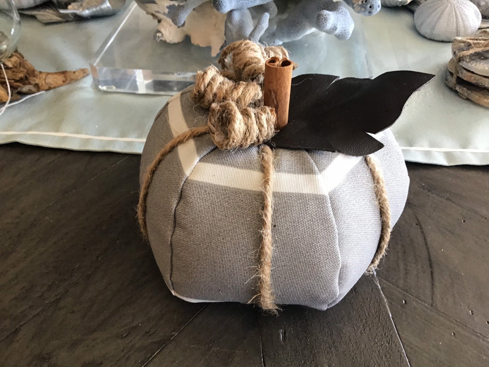 Add a touch of coastal charm to your home with this beautifully handcrafted Farmhouse Grey Stripe Fabric Pumpkin. Its soft fabric and warm colors perfectly complement any autumn display, whether on your mantle or your entryway. This pumpkin captures the essence of Texas' rustic beauty, ideal for creating your own pumpkin patch by the sea.