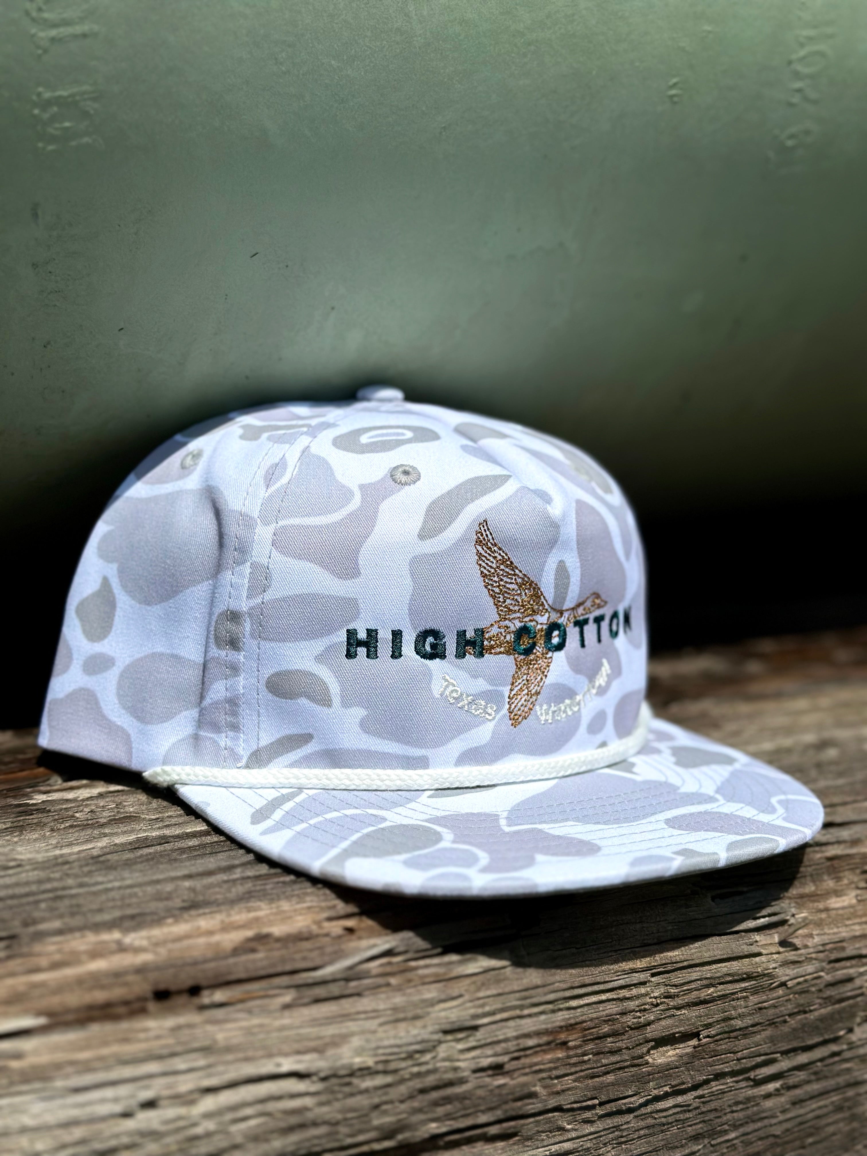 Embrace the wild side of Texas with the Old School Duck hat from High Cotton Hat Co. Featuring a trendy 5-panel design in a striking Blizzard Duck Camo, this hat is perfect for hunting trips or weekend getaways. The breathable fabric and adjustable fit ensure comfort whether you're out in the field or enjoying a casual day with friends.