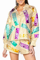 Stand out in style with this eye-catching button-up top featuring bold metallic gold stripes and an intriguing street sign design. This unique piece not only elevates your wardrobe but also brings a sense of playfulness to your everyday look. Perfect for those who enjoy making a fashion statement, this top will surely turn heads.