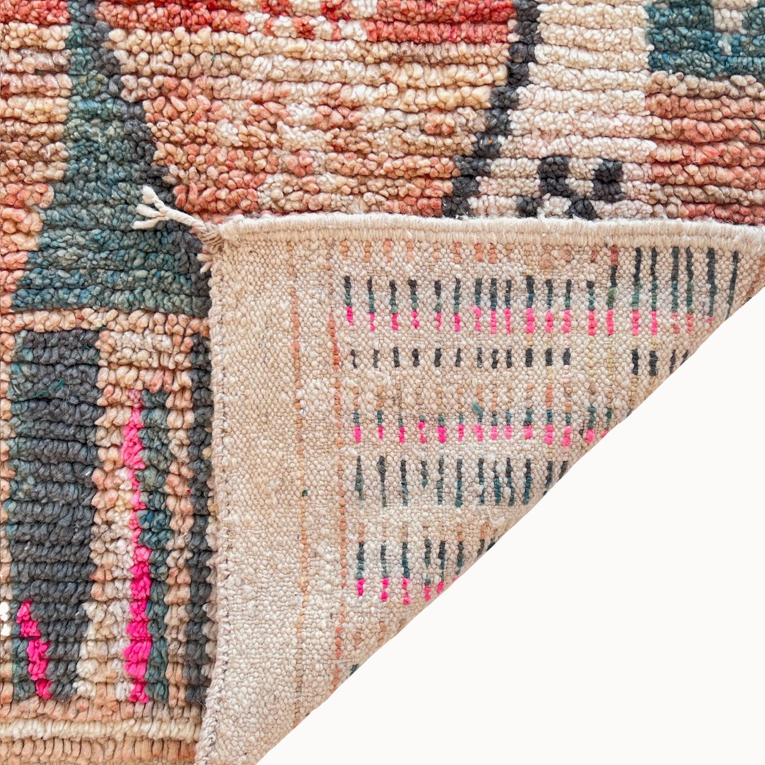 - Hand-knotted in the Atlas Mountains of Morocco using traditional Amazigh weaving techniques.