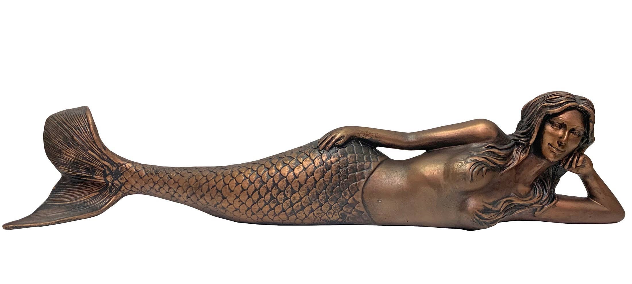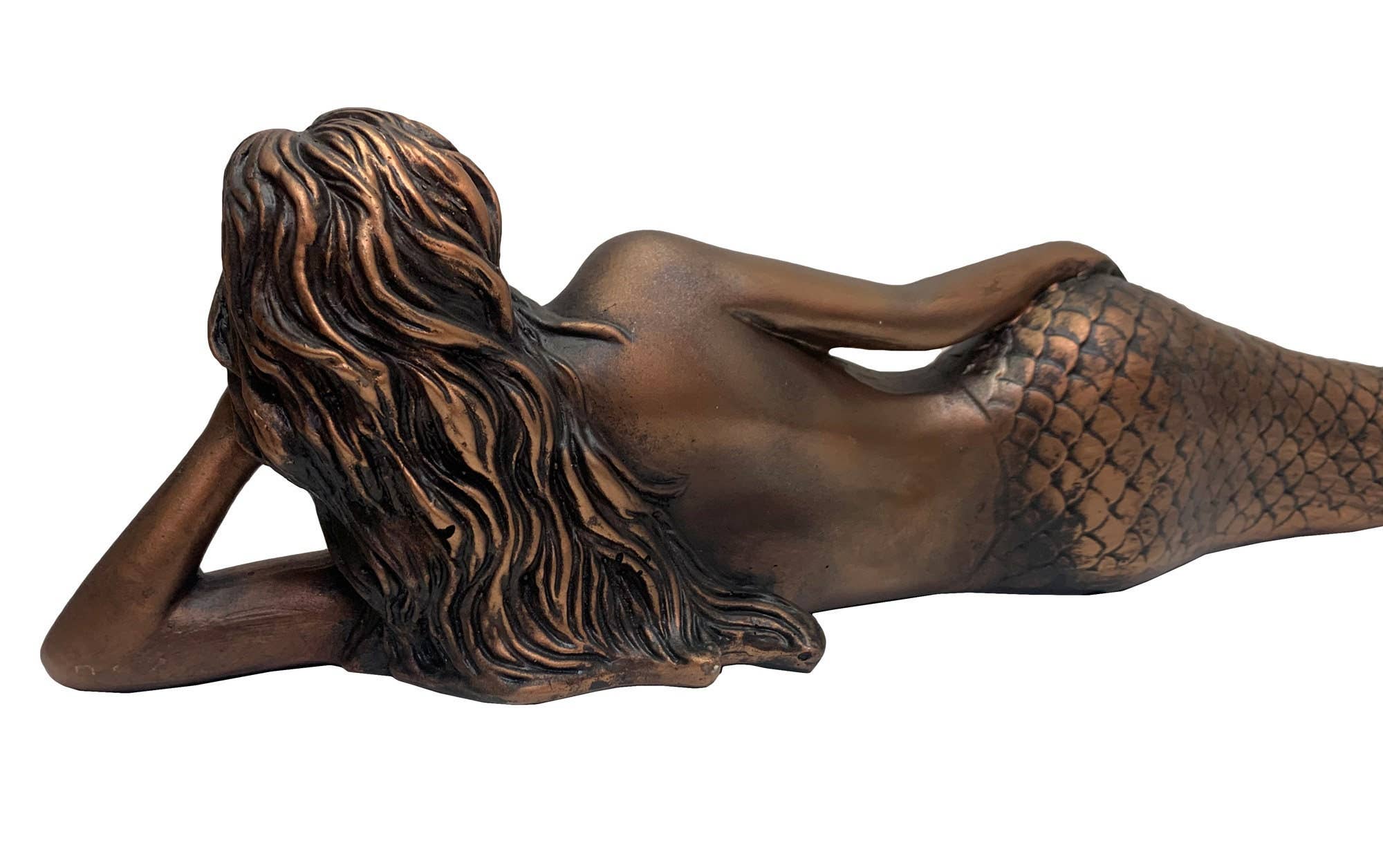Bring a touch of coastal charm to your space with our Little Dreamy Lying Mermaid sculpture. Crafted from durable resin and hand-painted in a radiant copper finish, this elegant mermaid rests gracefully with a serene expression, making her a perfect accent for any room. At 25 inches long, she’s ideal for displaying on a shelf, ledge, mantel, or console table—adding a whimsical yet sophisticated coastal vibe to your home decor.