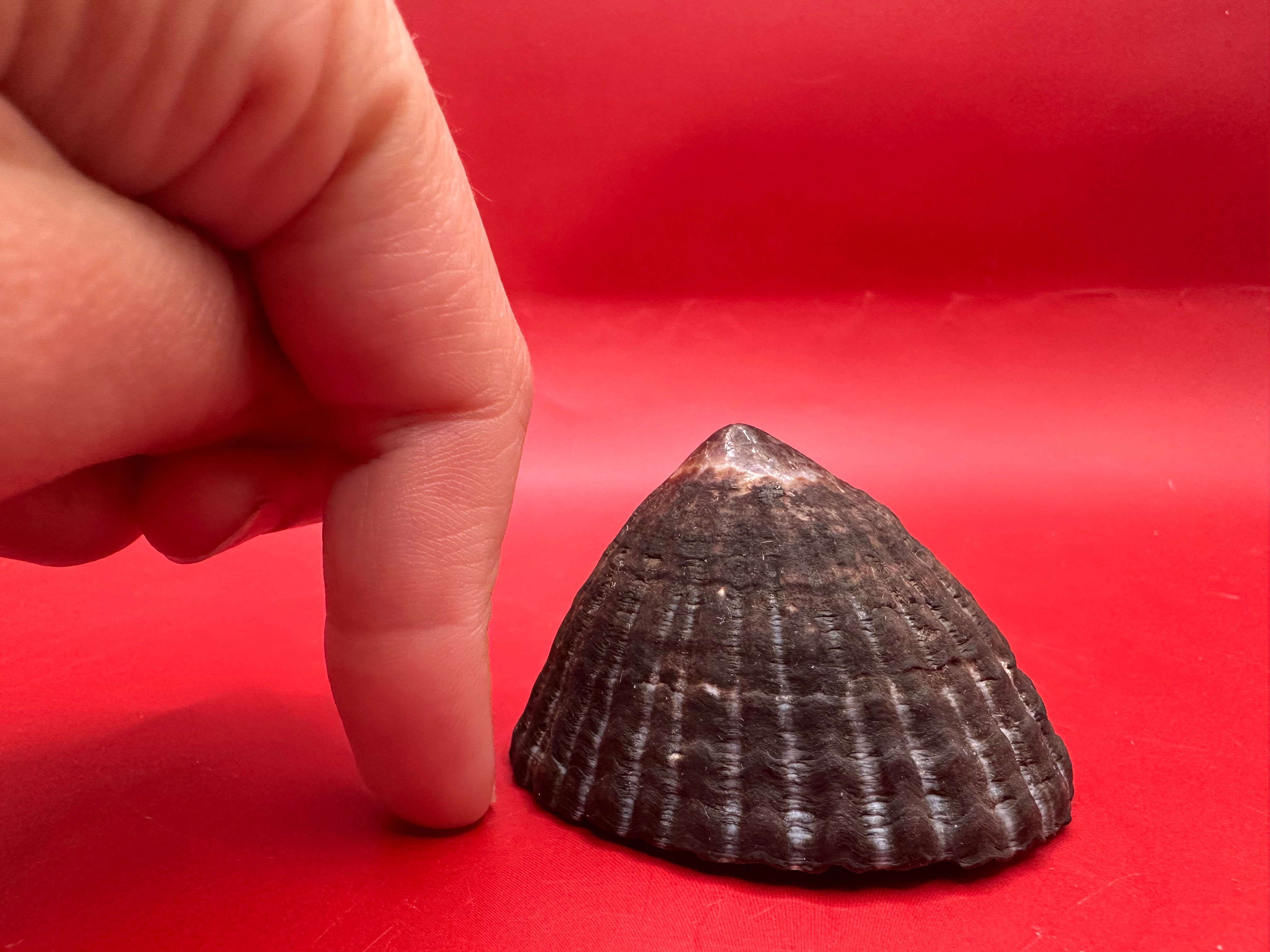 This extraordinary extra large Nacella magellanica limpet shell, collected from the pristine waters of Argentina, showcases a stunning blend of textures and colors. With its deep ribbing and striking dark hue, this 6 cm specimen serves as a captivating conversation starter, perfect for any coastal-themed decor or shell collection.