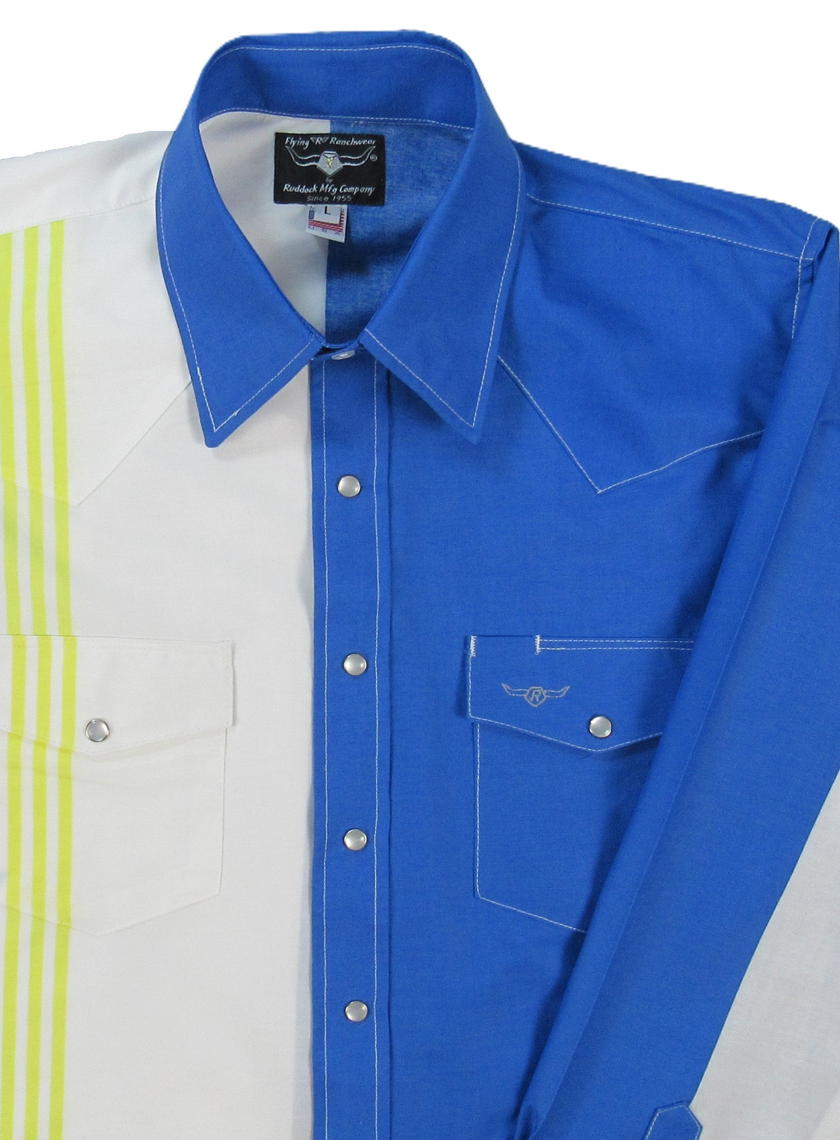 Finally, a retro stripe shirt you'll want to be seen in! Perfect for the office, cruise, or favorite watering hole. Engineered stripes in throwback colors of royal, red, and yellow are on point, plus it's cut in our classic western fit. Made in USA, 100% Cotton ~ Tall sizes