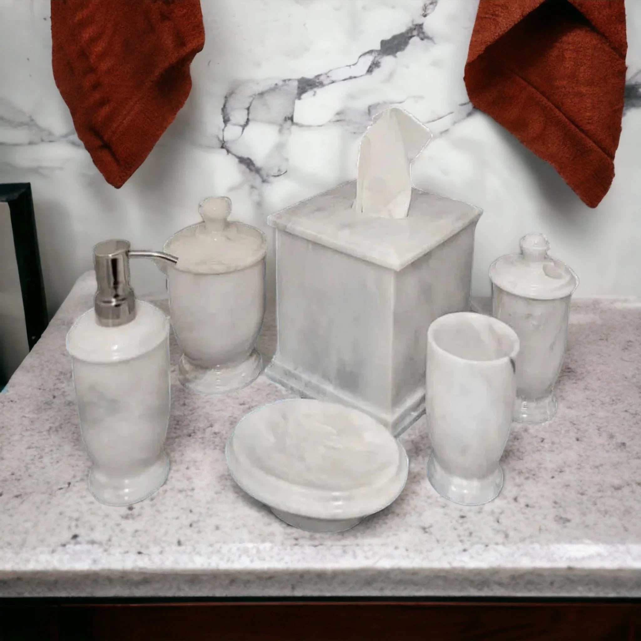 Experience the luxurious charm of natural white marble with the White Bathroom Accessories Set of the Atlantic Collection. This set of six pieces are crafted from top grade marble, and are the perfect way to bring both beauty and sophistication into your bathroom. Create a radiant atmosphere with this stunning set!