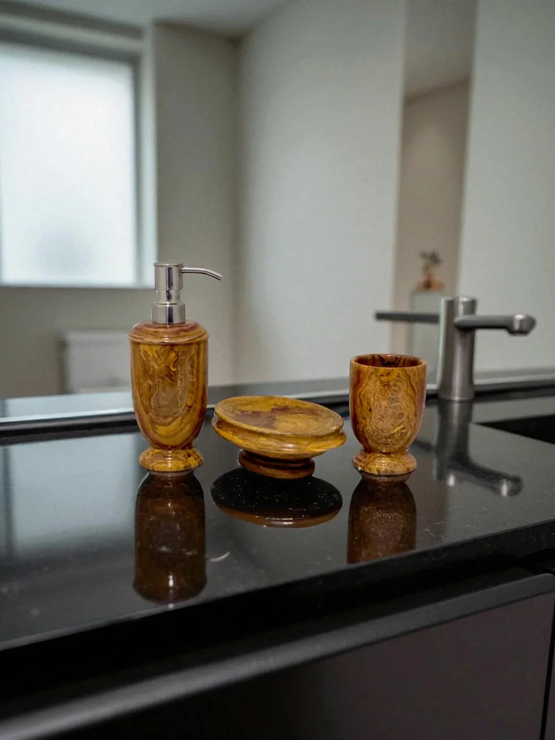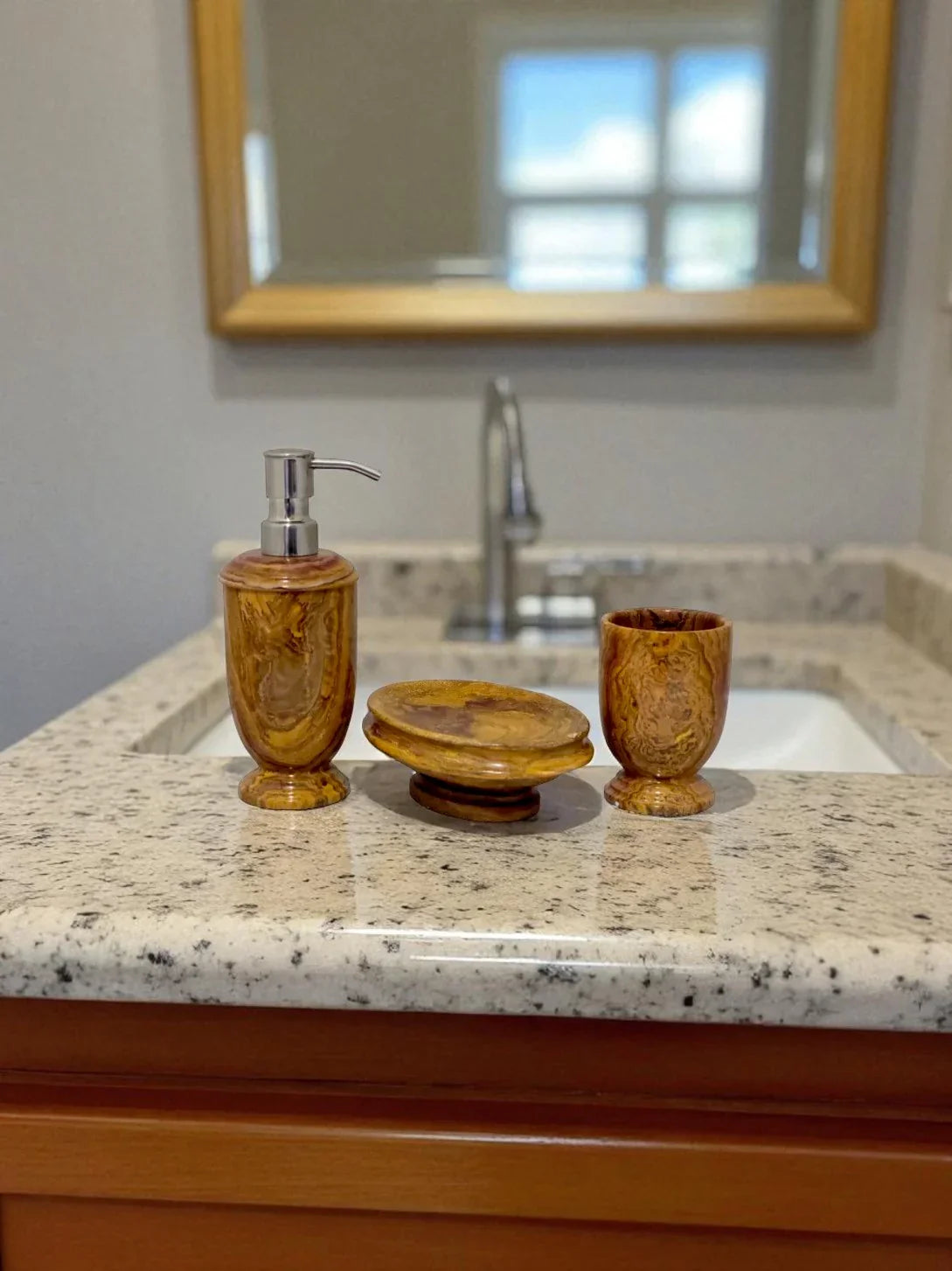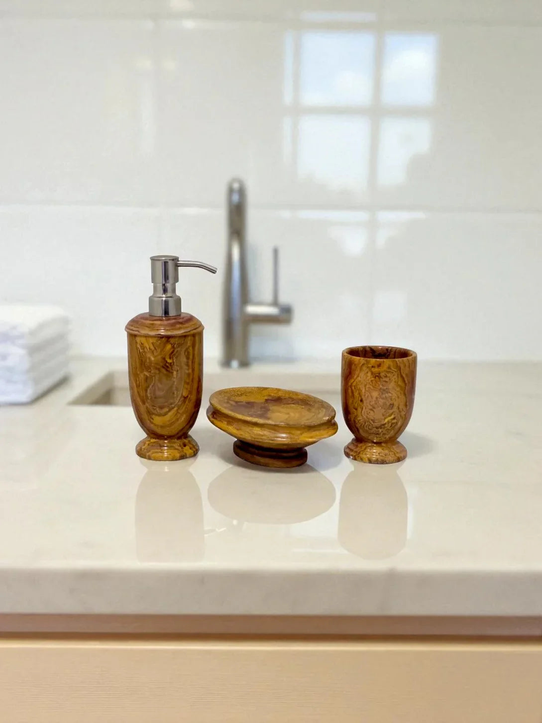Our Multi Brown Onyx 3 Piece Bathroom Set will add a luxurious touch to your bathroom. Expertly crafted in multicolored onyx, this classic collection of high-quality soap dish, lotion dispenser, and tumbler will remain a timeless staple for years to come. Benefiting from an extraordinary level of durability, this set is a reliable and indispensable bathroom must-have.
