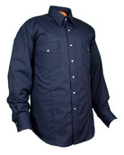 This shirt is a real throwback to classic western ranch styling with sewn in creases in front and back, making the shirt slightly more tapered than our regular western fit. Made in a dark navy blue 65% polyester/35% cotton dress twill that won't shrink and is unbelievably durable for its weight. It practically scares away snags, tears, stains, and wrinkles. Full western make with front and back yokes, western pockets and flaps, and snap closures. See why this is one of our most popular styles. Big and Tall sizes available. Made in USA.