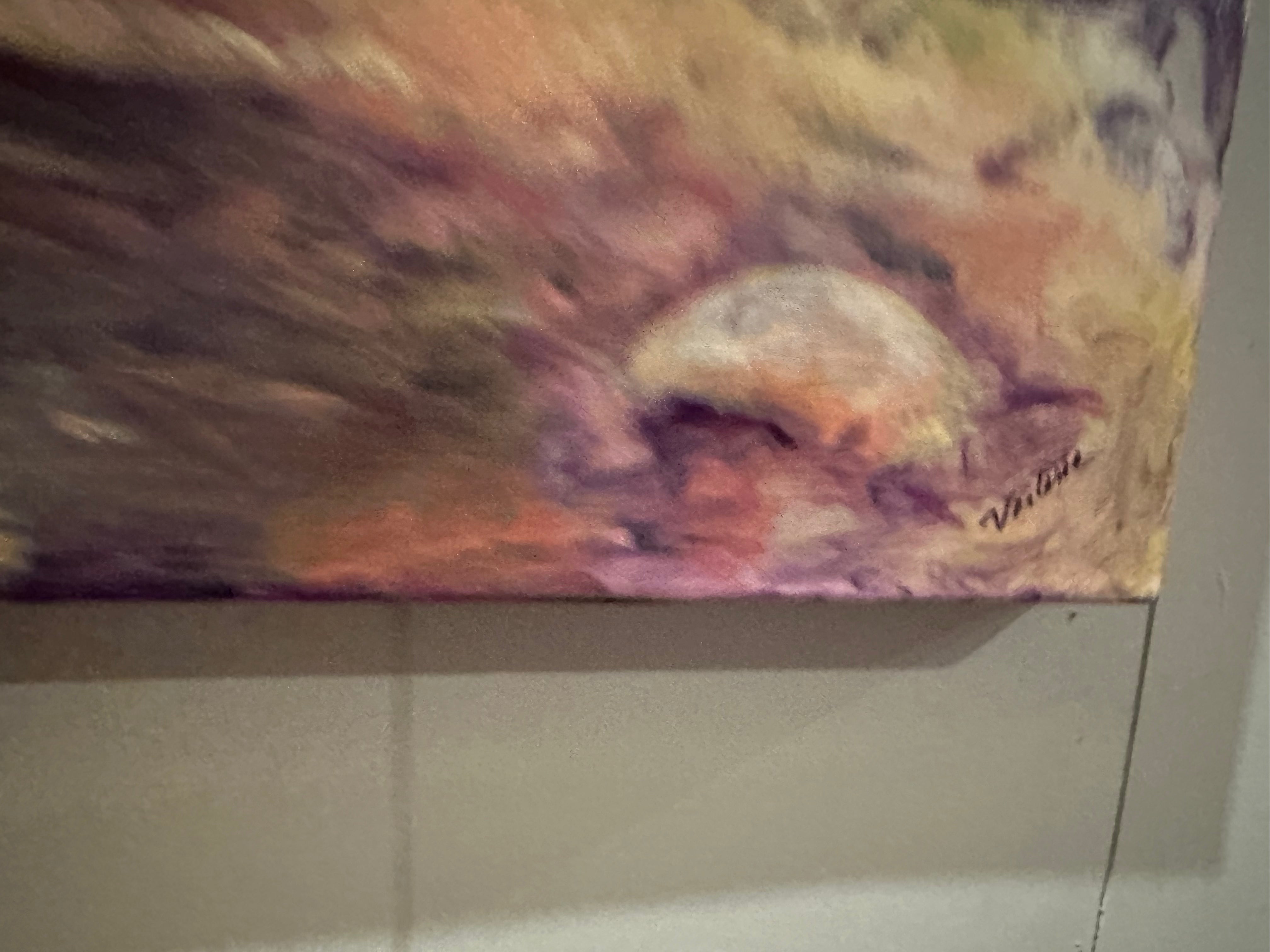 Experience the serene beauty of coastal twilight in this captivating work by local artist Verlene Beckwith. “I Spy Twilight Tide” features a large conch shell resting at the water’s edge, bathed in the soft purples, pinks, and golds of the setting sun. Gentle waves and subtle reflections create a peaceful, dreamlike scene that captures the magic of evening by the sea.