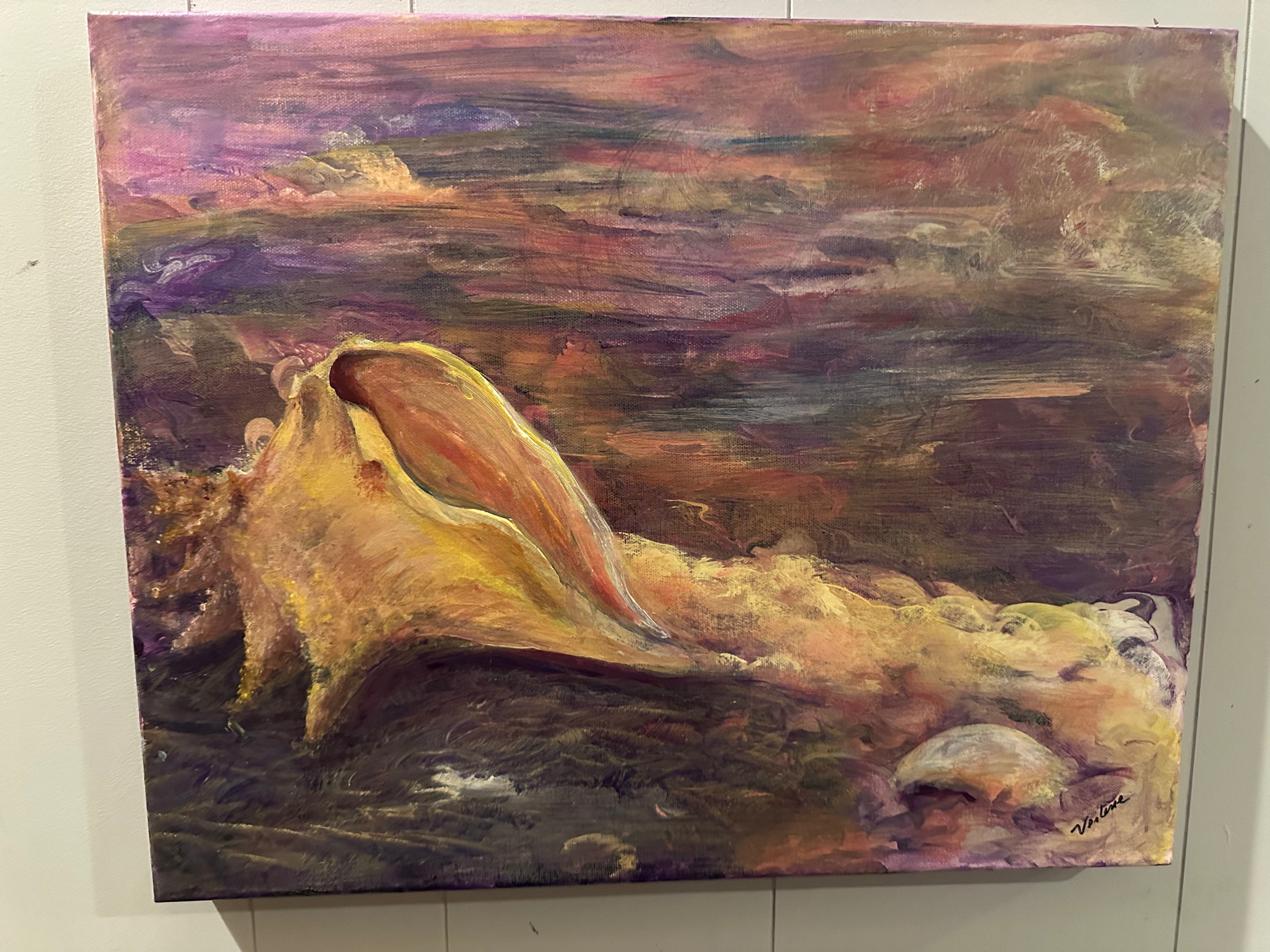 Experience the tranquil beauty of twilight by the sea with this breathtaking acrylic painting by local artist Verlene Beckwith. The large conch shell nestled at the water's edge reflects the soft hues of sunset, creating a serene ambiance that evokes the peacefulness of coastal evenings.