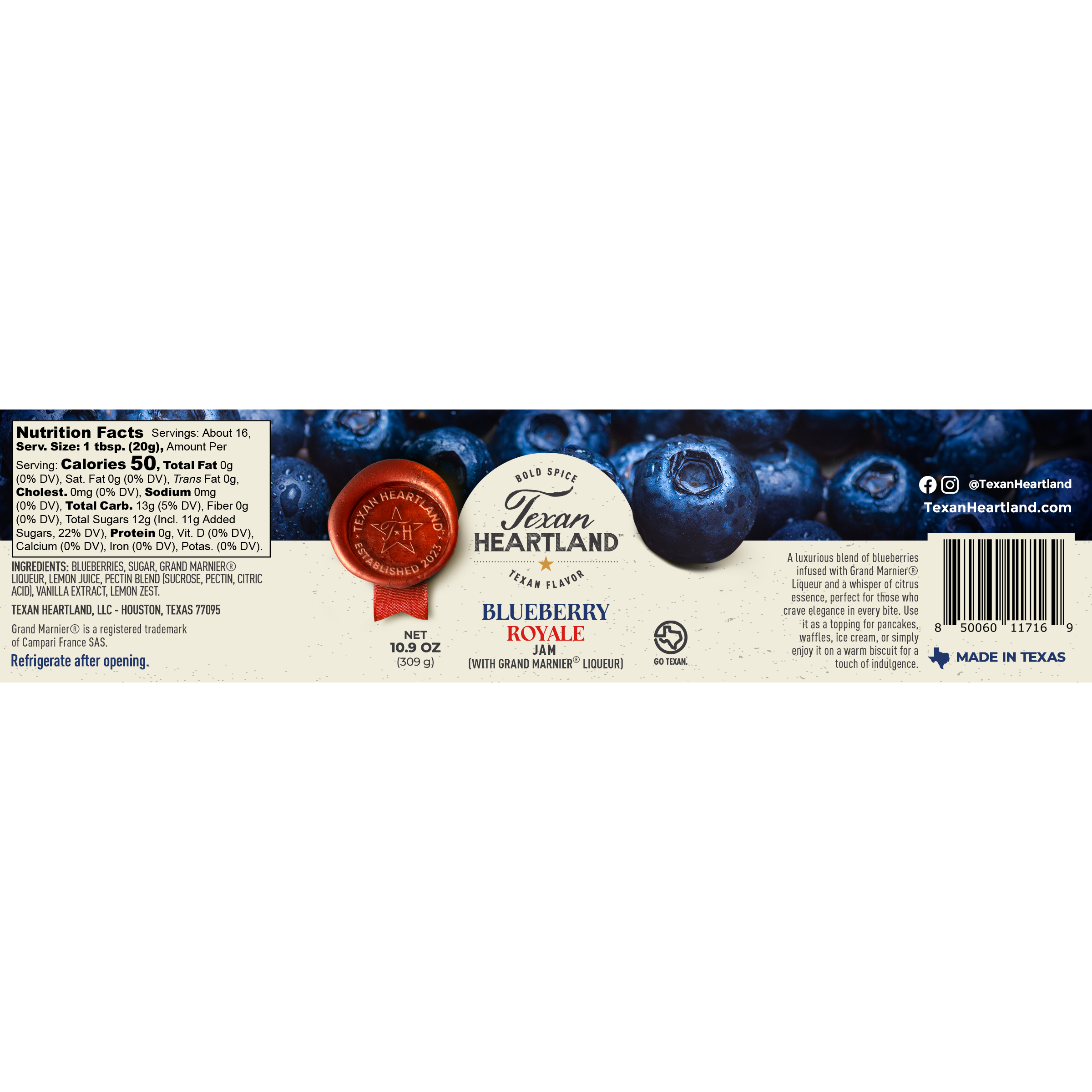 Experience luxury in a jar with our Blueberry Royale Jam. Handcrafted with luxurious blueberries, Grand Marnier® Liqueur and a hint of citrus, this sophisticated jam delivers a rich, indulgent flavor profile. Perfect for breakfast spreads, desserts, and beyond, it elevates every bite with its bold yet elegant taste. Whether draped over pancakes or waffles, swirled into ice cream, or spread on warm toast, this jam transforms ordinary moments into gourmet experiences. Bring elegance to your table with Texan Heartland's Blueberry Royale Jam.