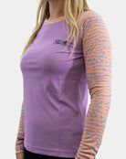 The Indi | Lavender is your mellow-day MVP—cool tones, smooth lines, and performance that doesn't flinch when the tide gets rowdy. This one's for the ladies who know how to keep it low-key but still reel in the big ones. With a soft lavender body and pastel wave-print sleeves, it's equal parts subtle and standout.