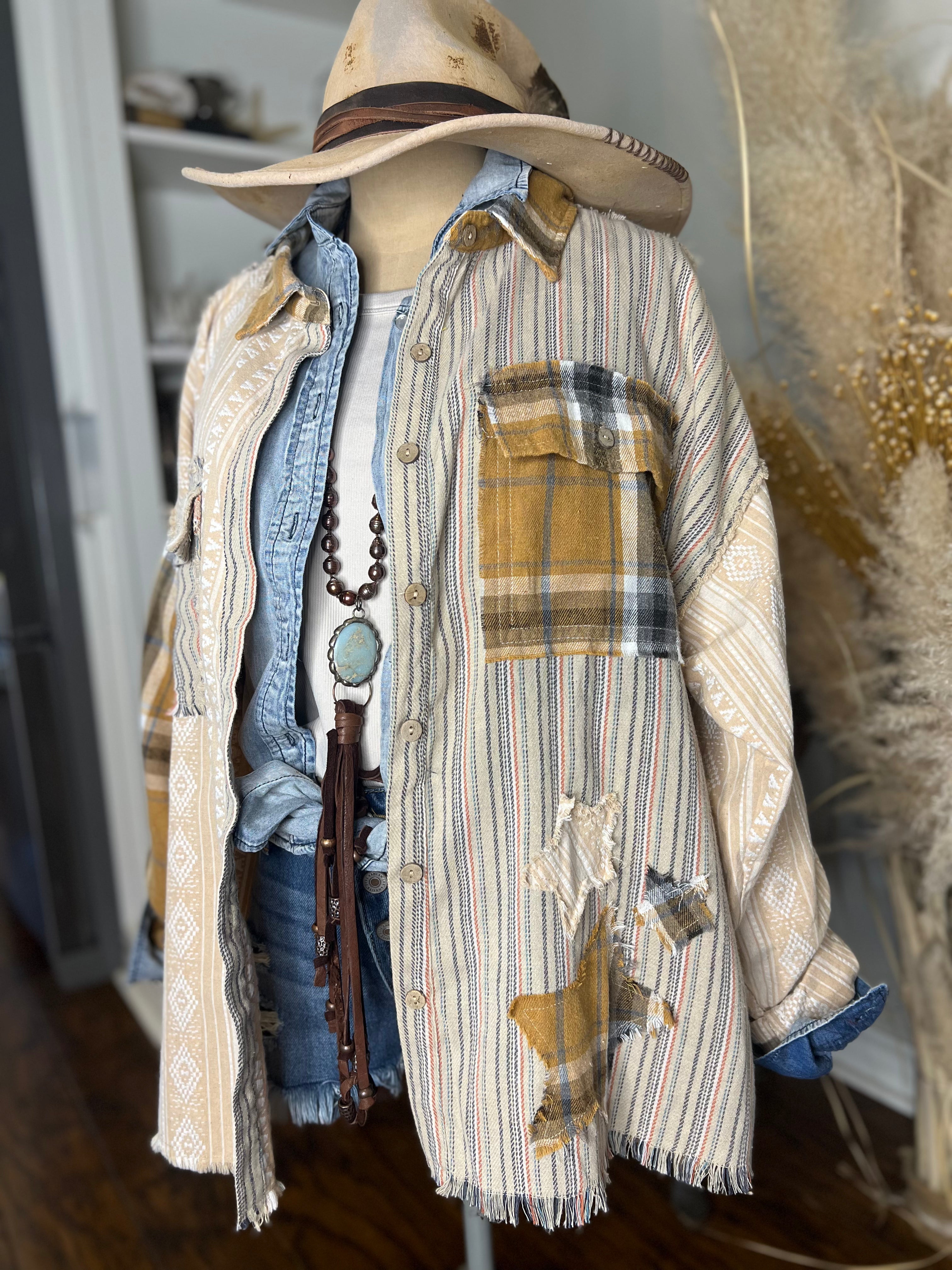 Welcome the cool autumn nights with the stylish and comfortable Plaid Star Shirt. Made with a mixed fabric media, this shirt is perfect for the fall season and features fabric stars that add a unique touch to the back. Get ready for cozy fall vibes with this must-have piece.