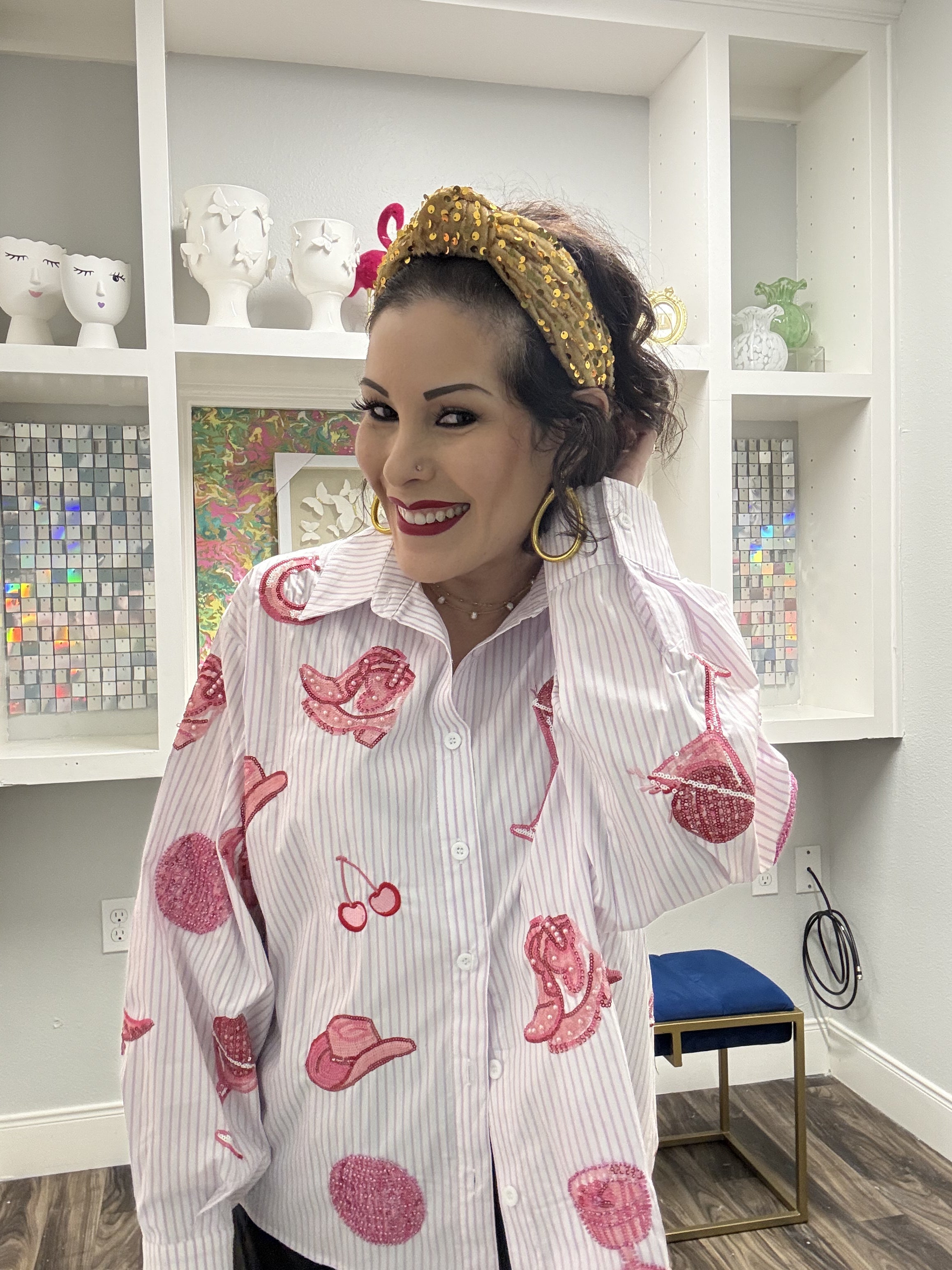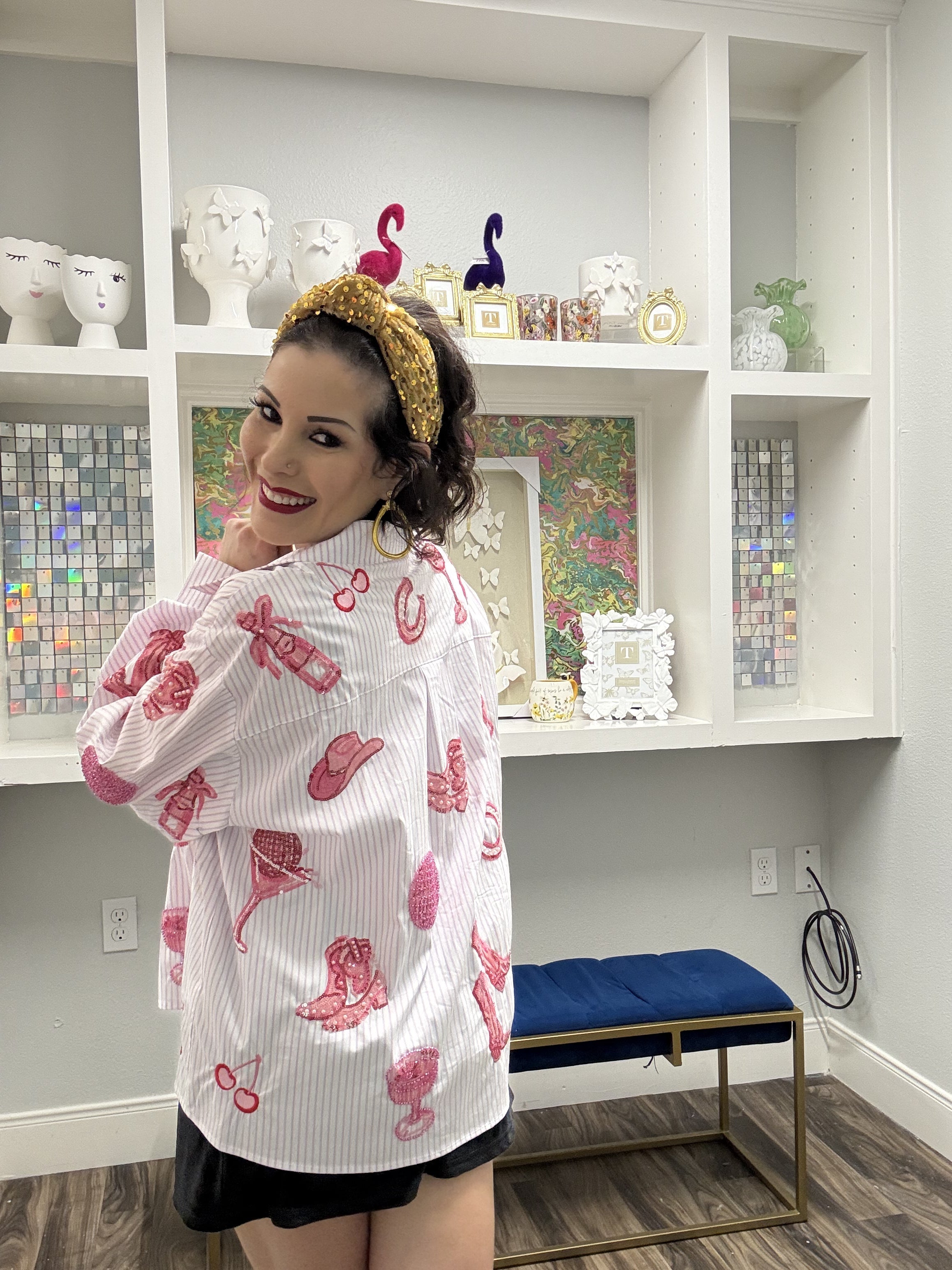 Boutique Bella Bella Queen of Sparkles Striped Pink Disco Cowgirl Icon Collared Top