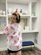 Step into the spotlight with this show-stopping striped pink disco cowgirl icon collared top! Featuring bold vertical stripes and a classic collared neckline, this piece brings retro glamour with a modern twist. The playful cowgirl-inspired design and shimmering disco details make it perfect for turning heads at parties, festivals, or whenever you're ready to sparkle. Pair it with your favorite jeans or a skirt for an effortlessly chic look that celebrates your bold, fun side. Model is wearing a small