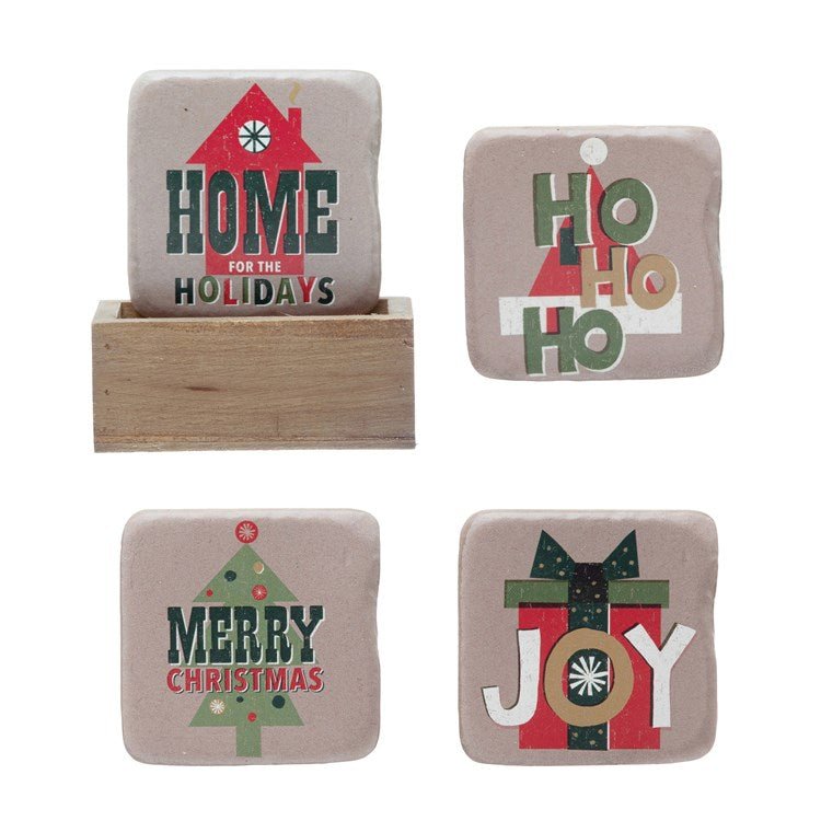 Add a festive touch to your holiday gatherings with these Square Resin Coasters with Holiday Saying & Wood Box Holder. This charming set includes four coasters, each featuring a cheerful holiday saying, and a wooden box holder to keep them neatly organized. Perfect for protecting your surfaces while spreading holiday cheer, these coasters are both functional and decorative, making them a delightful addition to any holiday decor.