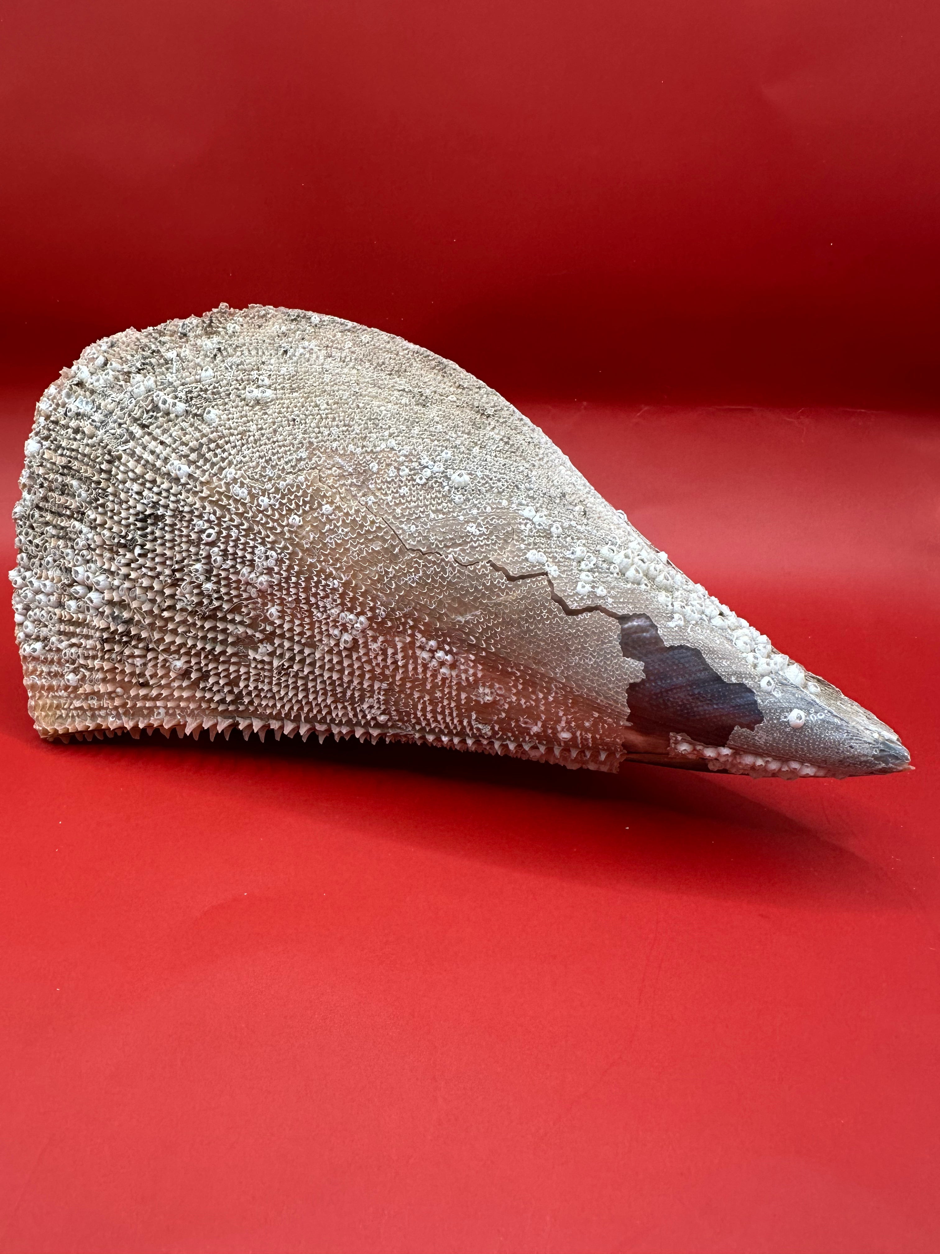 • Natural rigid pen shell with barnacle encrustations