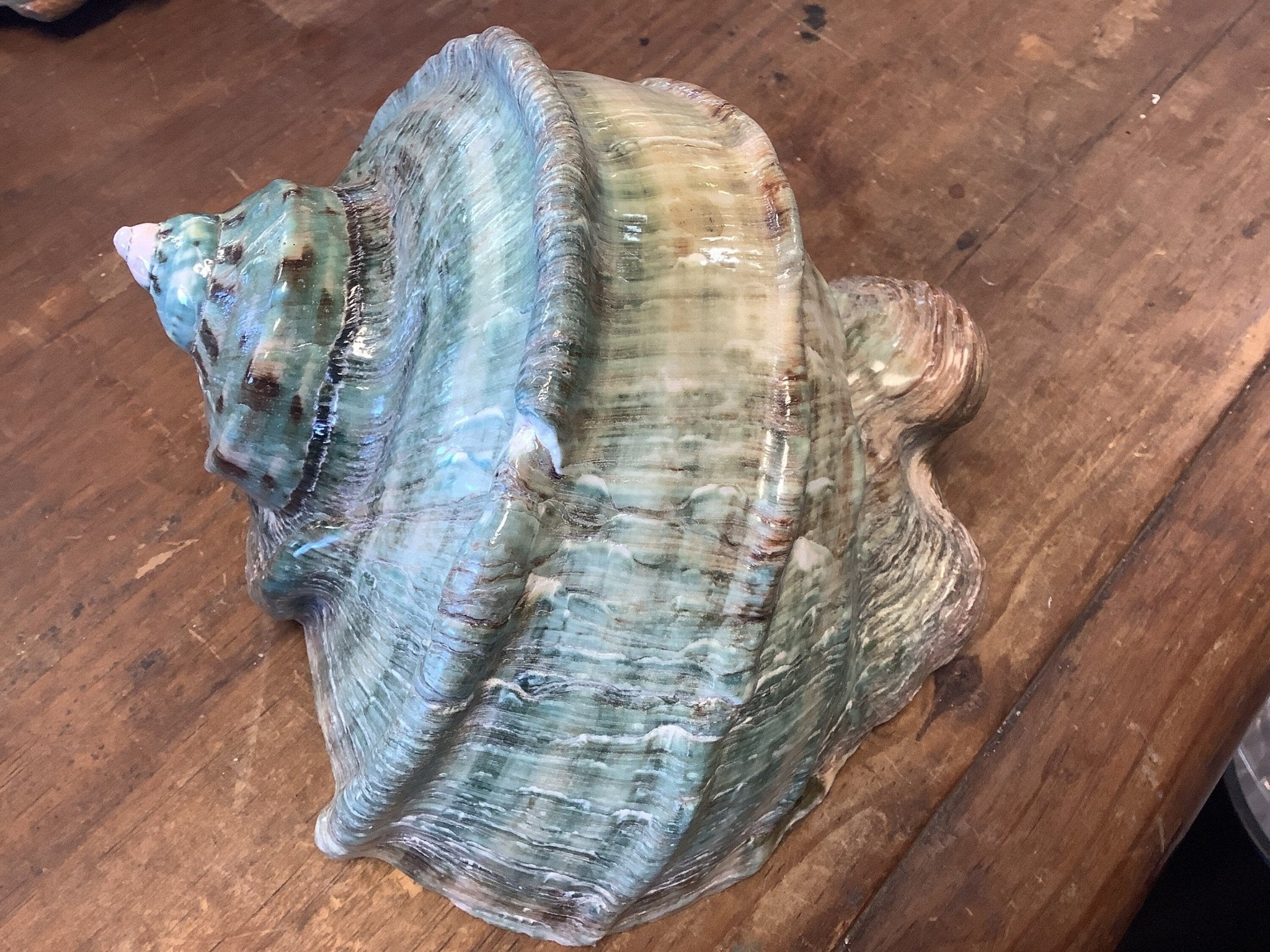 This shell shows evidence of its life in the ocean. Please see photos of its different characteristics.