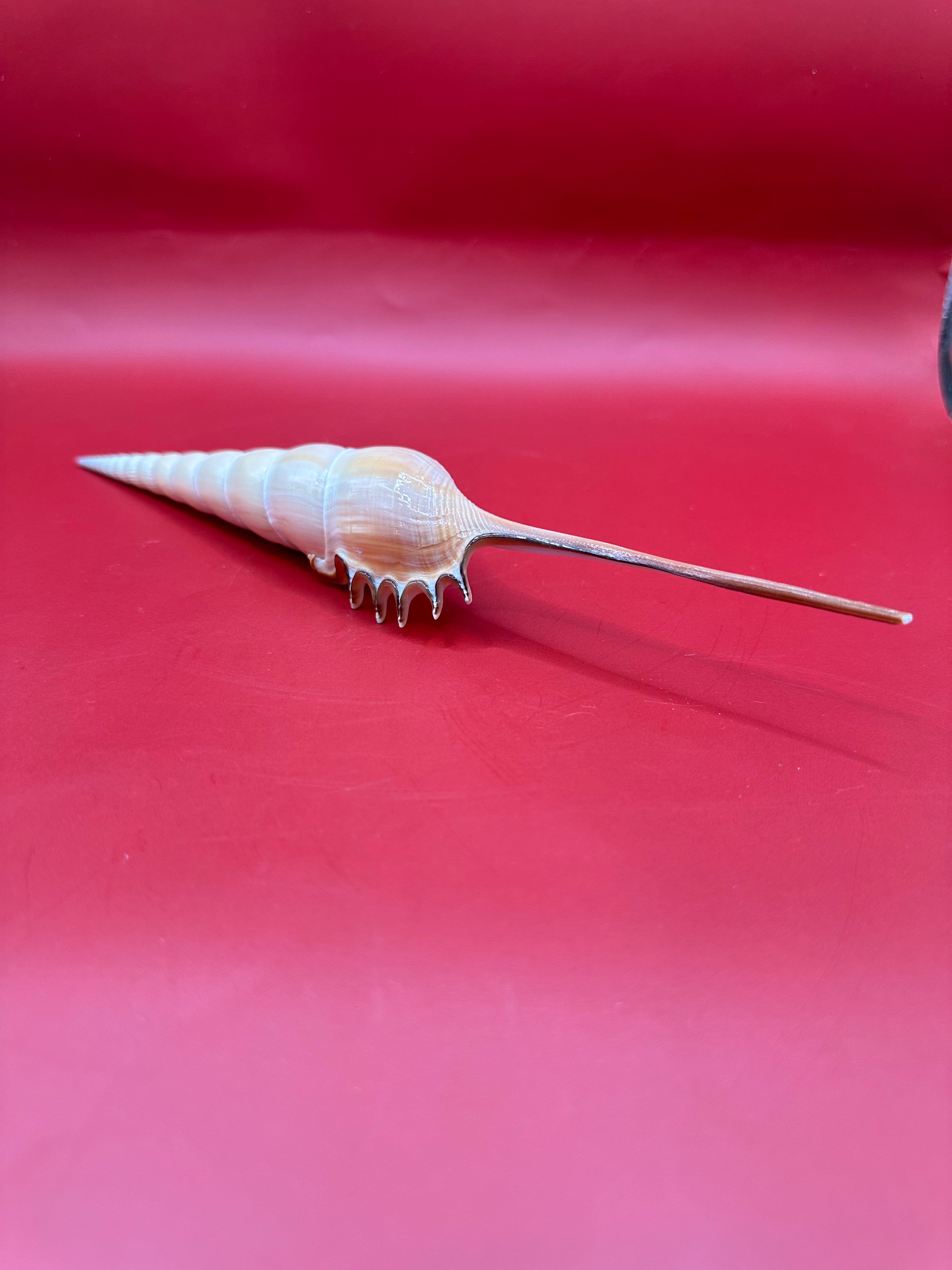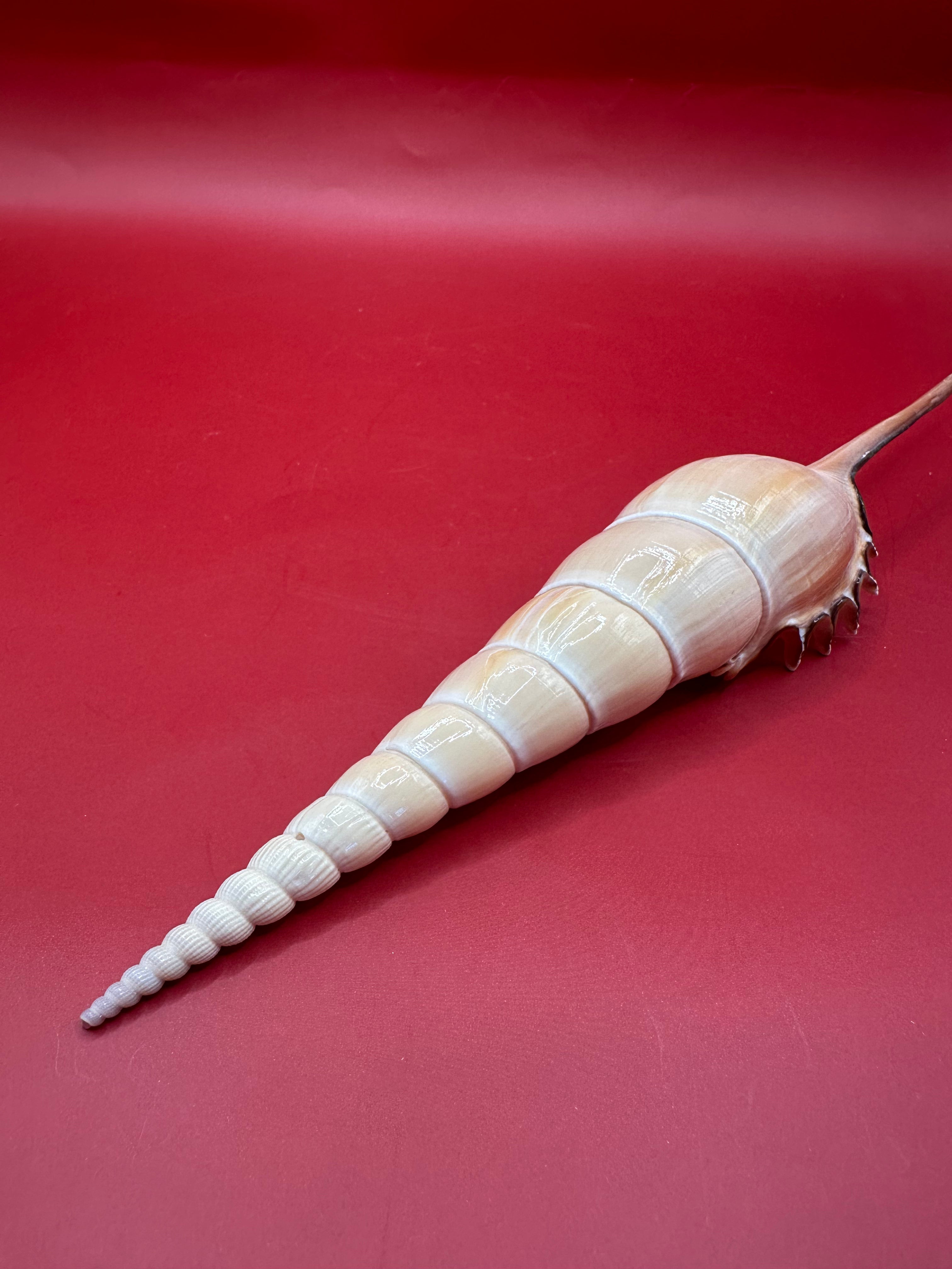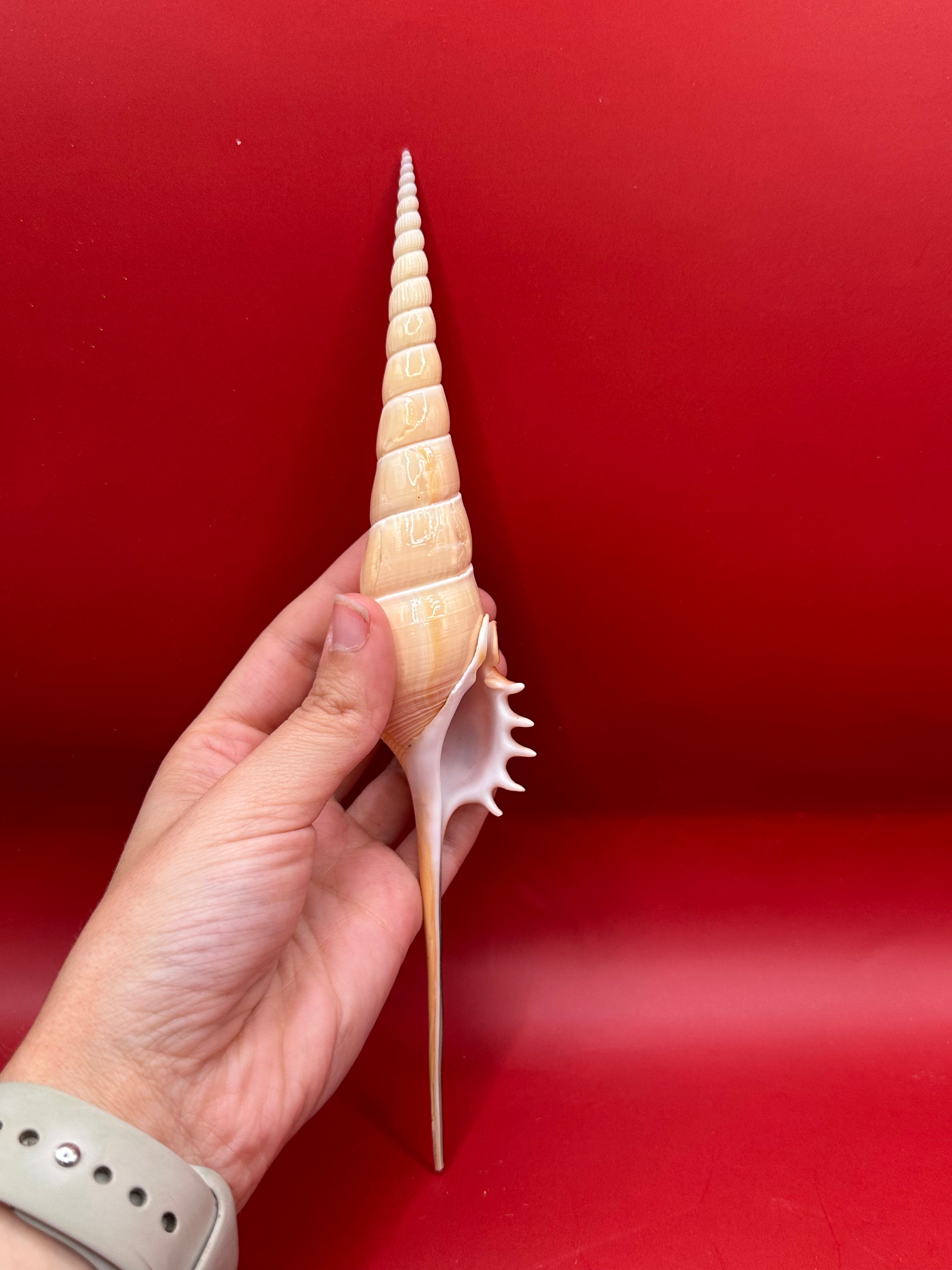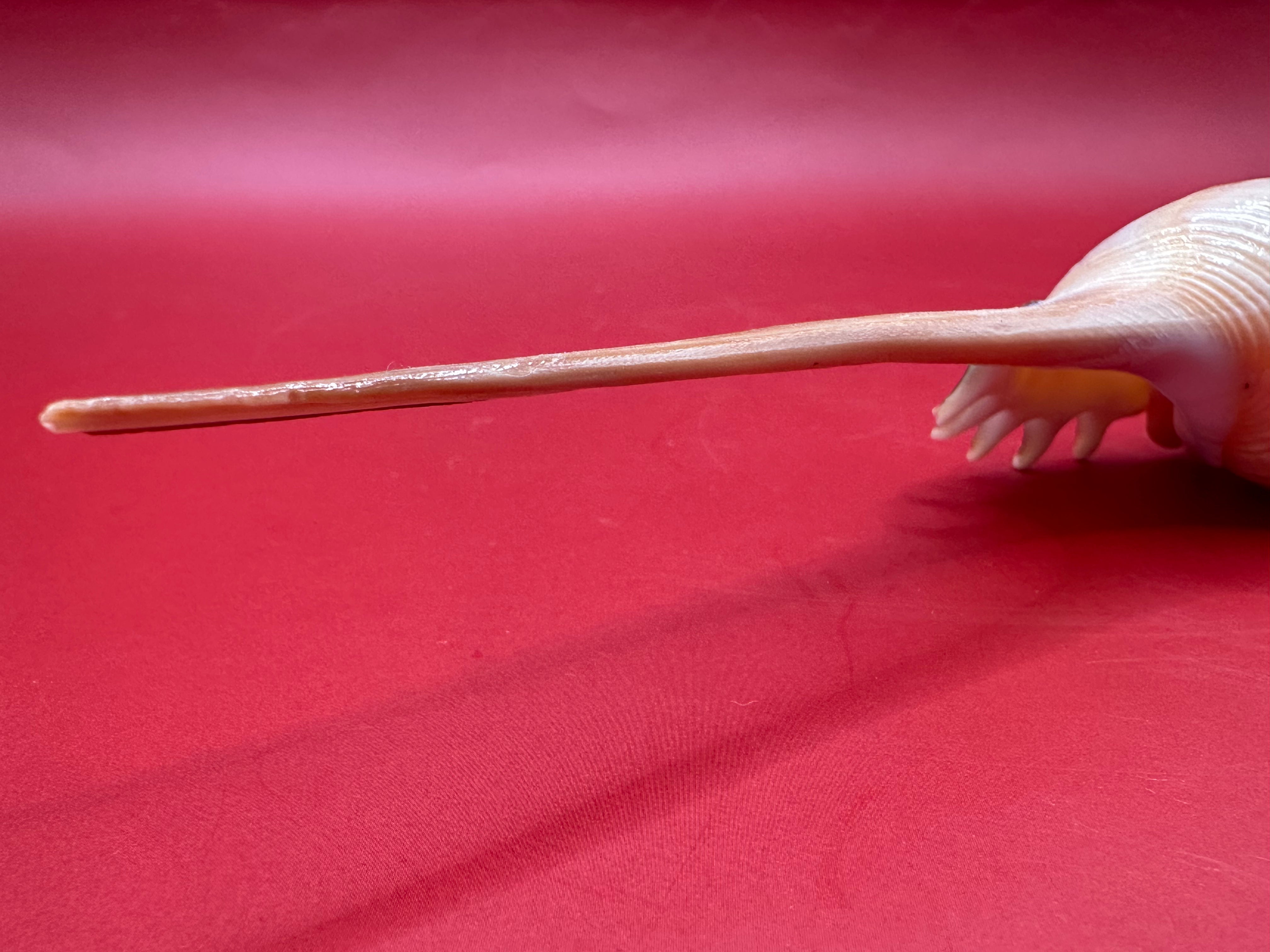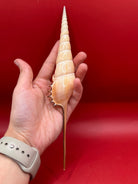 This striking Shinbone Tibia Shell, also known as Tibia fusus, showcases its elegant elongated form with a perfectly tapered spire and creamy natural sheen. Measuring approximately 9 inches, this shell is a true coastal treasure, ideal for display in a refined home setting or as part of a curated shell collection. Its smooth surface and dramatic extension make it a statement piece that embodies the beauty of the ocean.