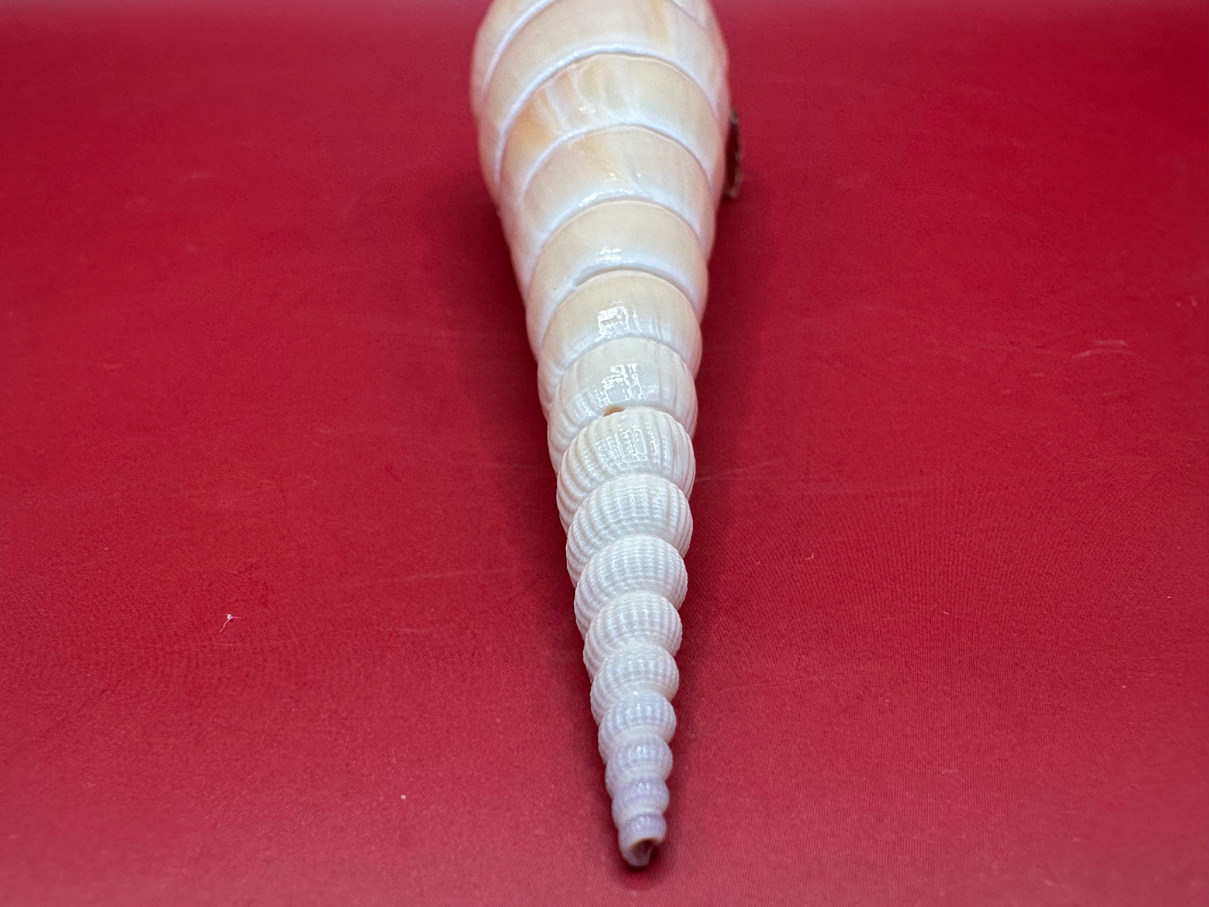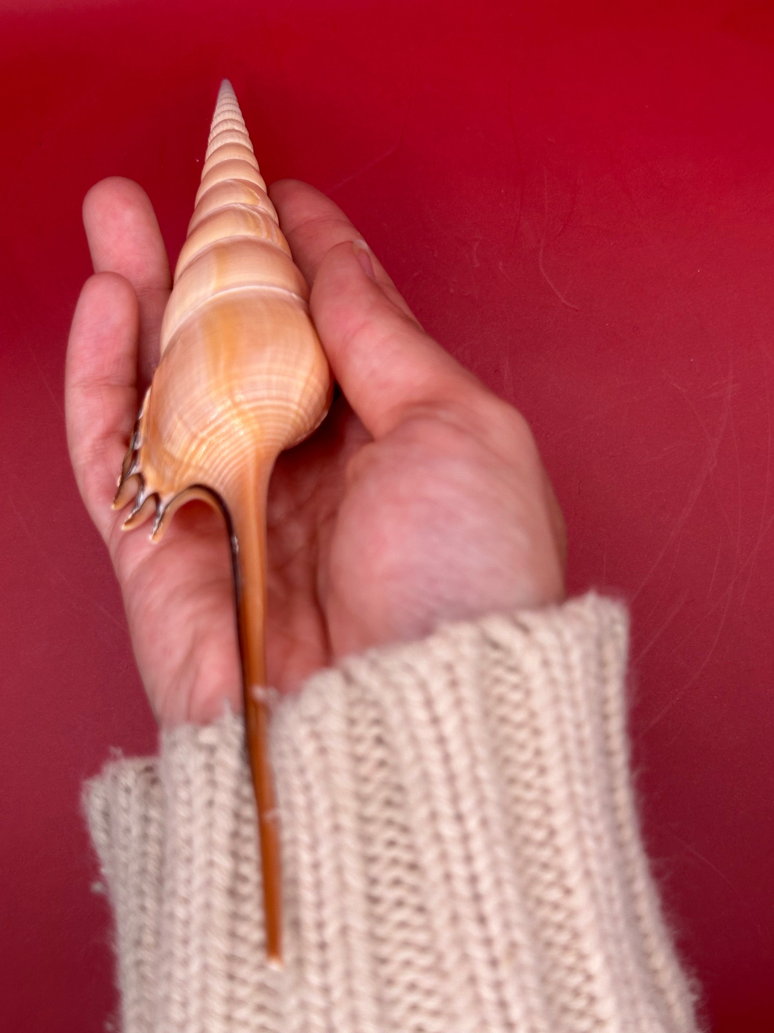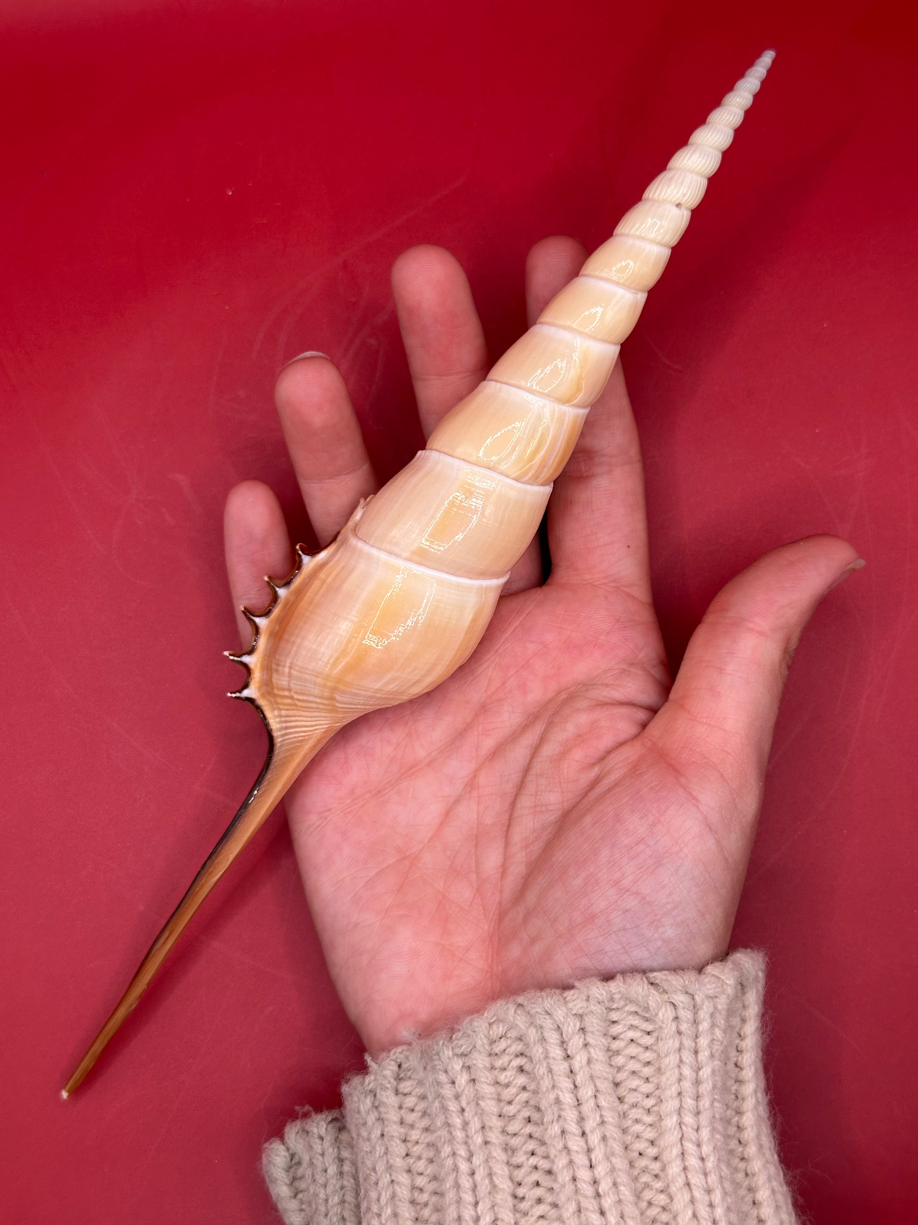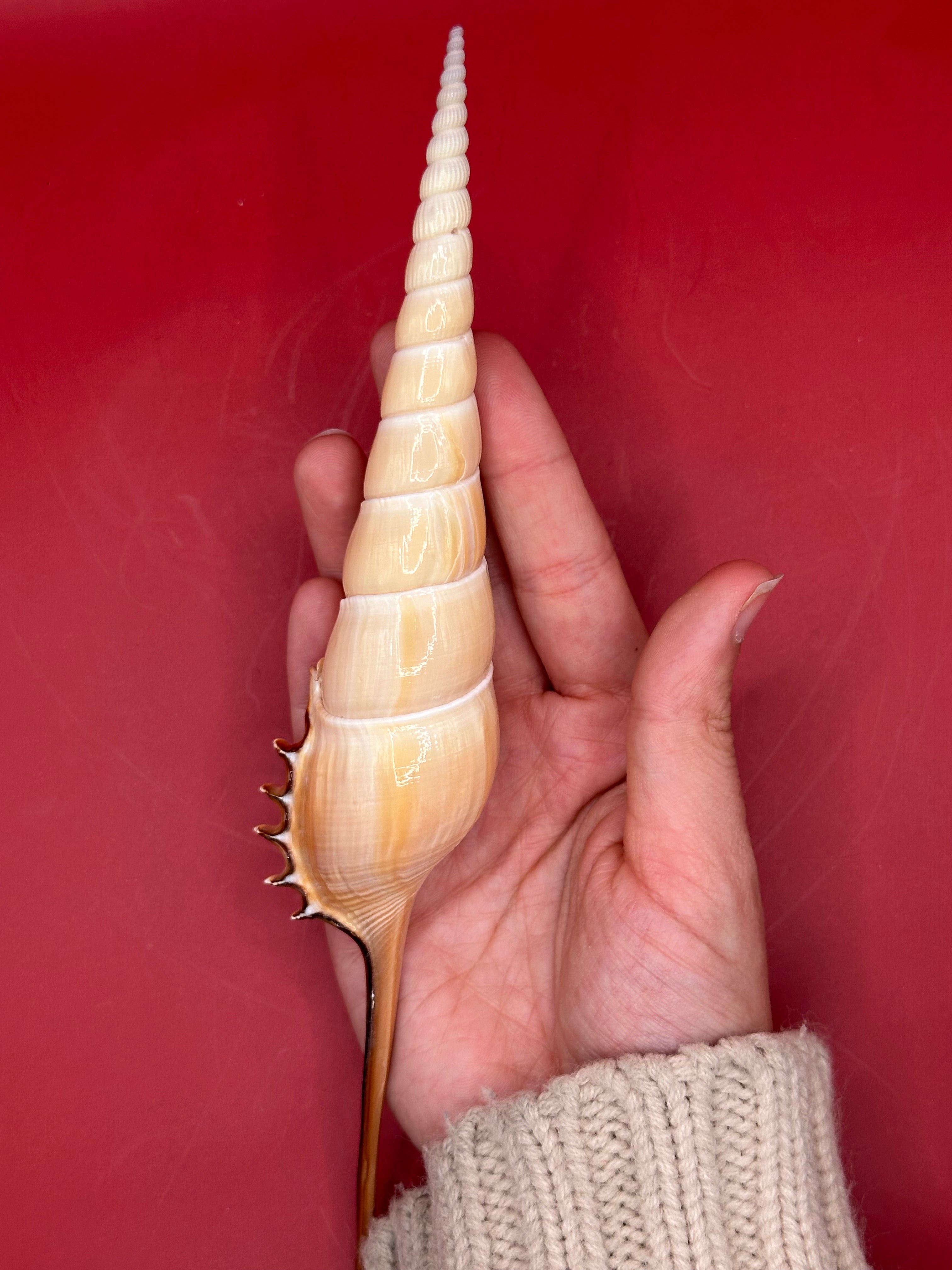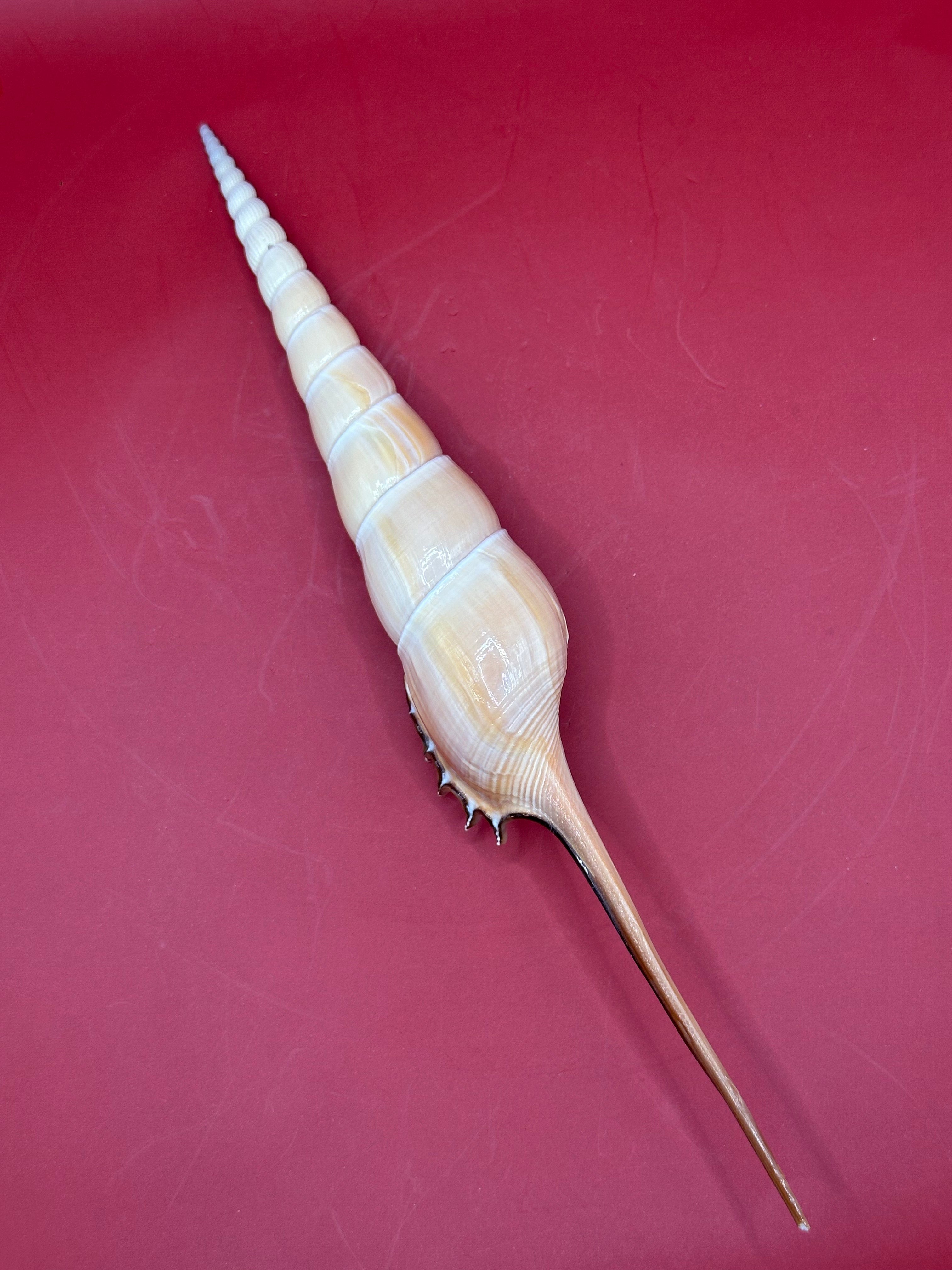 This striking Shinbone Tibia Shell, also known as Tibia fusus, showcases its elegant elongated form with a perfectly tapered spire and creamy natural sheen. Measuring approximately 9 inches, this shell is a true coastal treasure, ideal for display in a refined home setting or as part of a curated shell collection. Its smooth surface and dramatic extension make it a statement piece that embodies the beauty of the ocean.