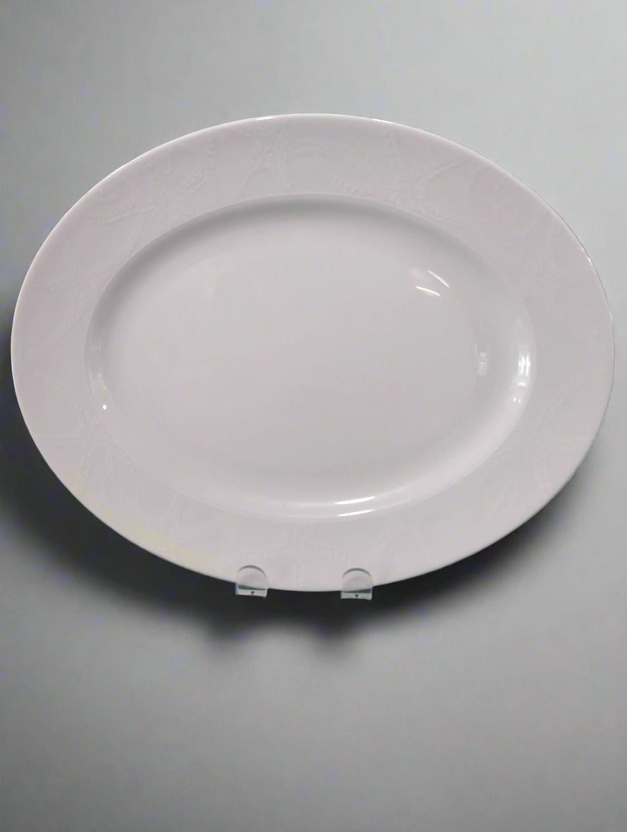 Here's a serving platter that offers coastal style in a refined white on white. Engravings of starfish playfully wrap around the surface of this pretty bowl. Intricate details in white on white mimic the look of embossing in this raised pattern.