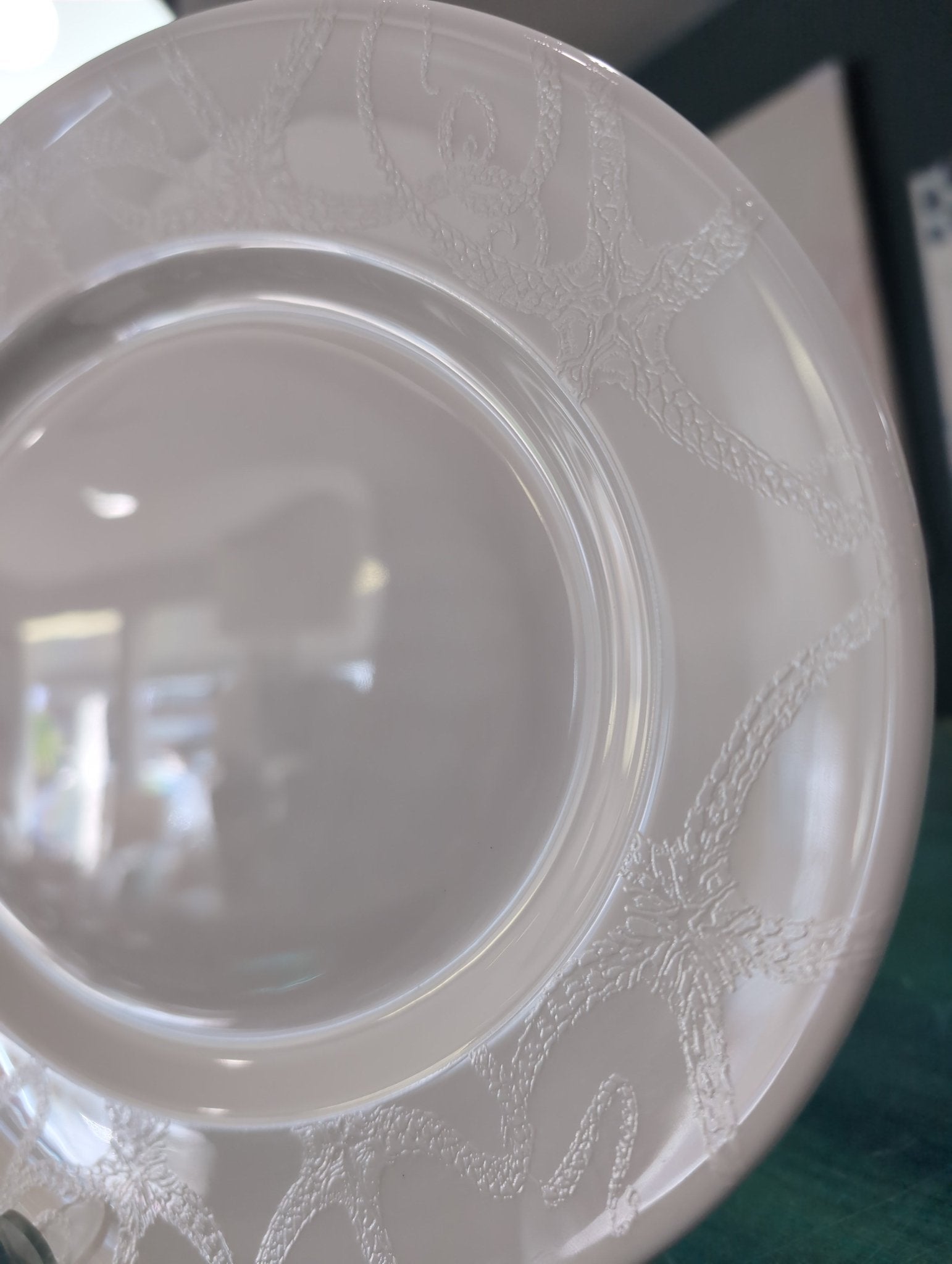 Bring a touch of the coast to your dining experience with this elegant serving platter adorned with intricate starfish engravings. The refined white on white design offers a subtle sophistication, perfect for displaying your culinary creations or serving up snacks at a gathering.