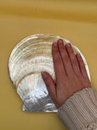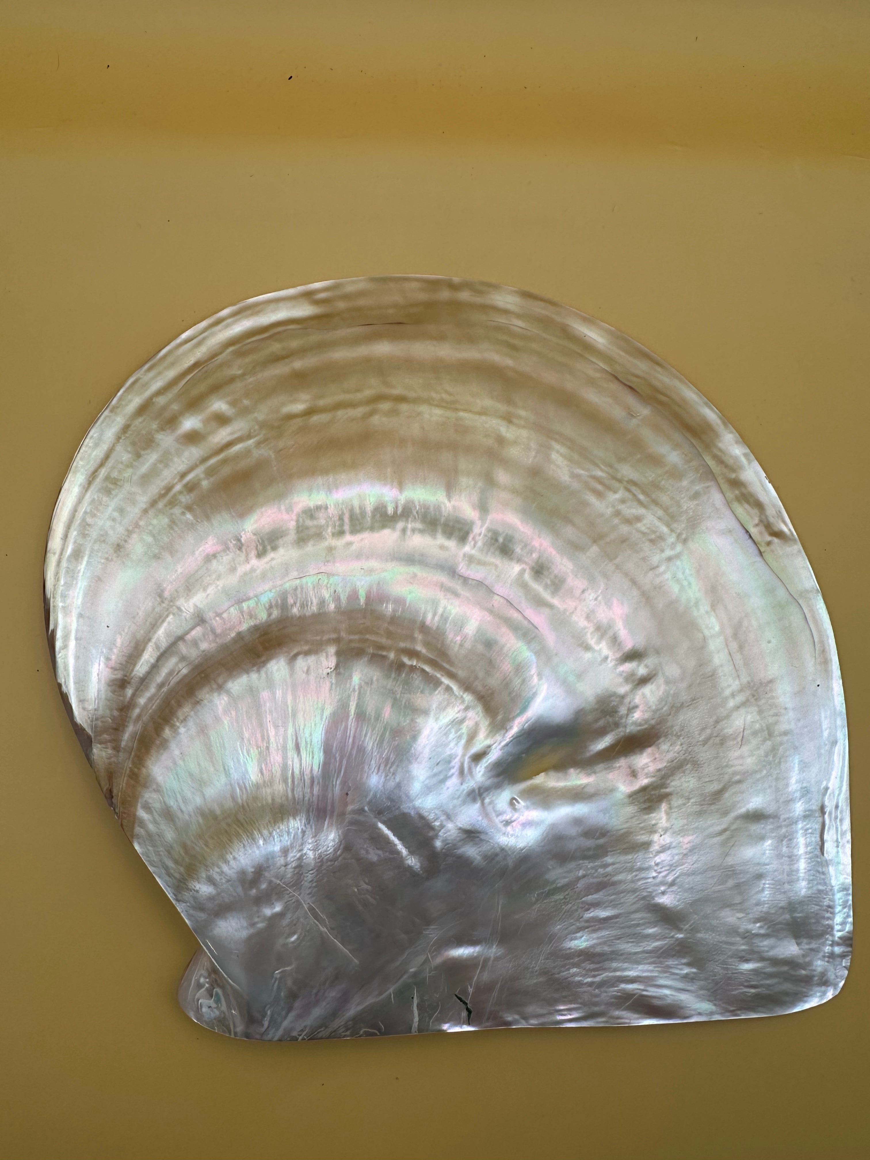 This extra-large polished Gold Mother of Pearl shell showcases radiant nacre with shimmering hues of white, cream, and subtle gold. Carefully polished to a smooth finish, this natural shell from the Pinctada maxima oyster has long been prized for its luminous elegance, making it a striking accent for coastal interiors or shell displays.
