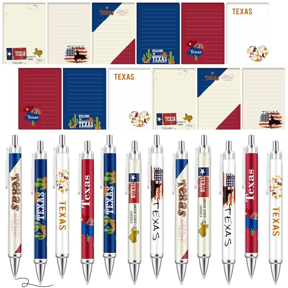 - Texas Stationery Set: the set includes 24 pieces notepad and pen gifts set for those who love Texas; It contains 12 Texas notepads and 12 Texas pens, each featuring six distinct styles; These Texas sticky notes not only brighten up your stationery collection but also serve as cheerful gifts and practical office supplies