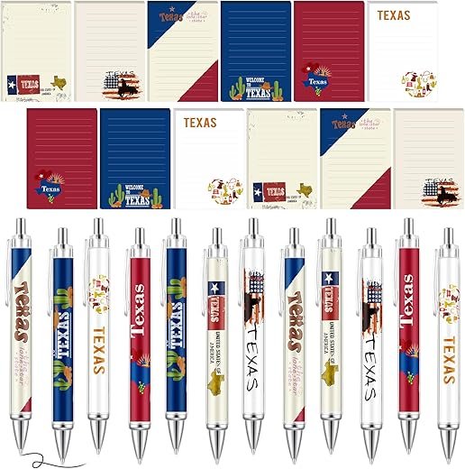 - Complete Set: 24 pieces total – 12 Texas-themed notepads and 12 matching pens.