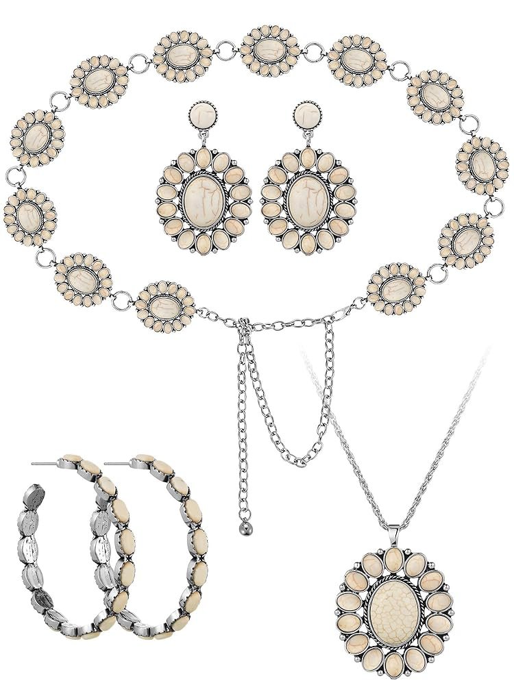 - Ideal Combination: incorporated in this package are 4 parts, including 1 western concho belt, 1 white turquoise necklace, 1 pair of dangling turquoise earrings, and 1 pair of hoop turquoise earrings; This comprehensive selection serves multiple needs, broadening your accessorizing options and ensuring cohesive style