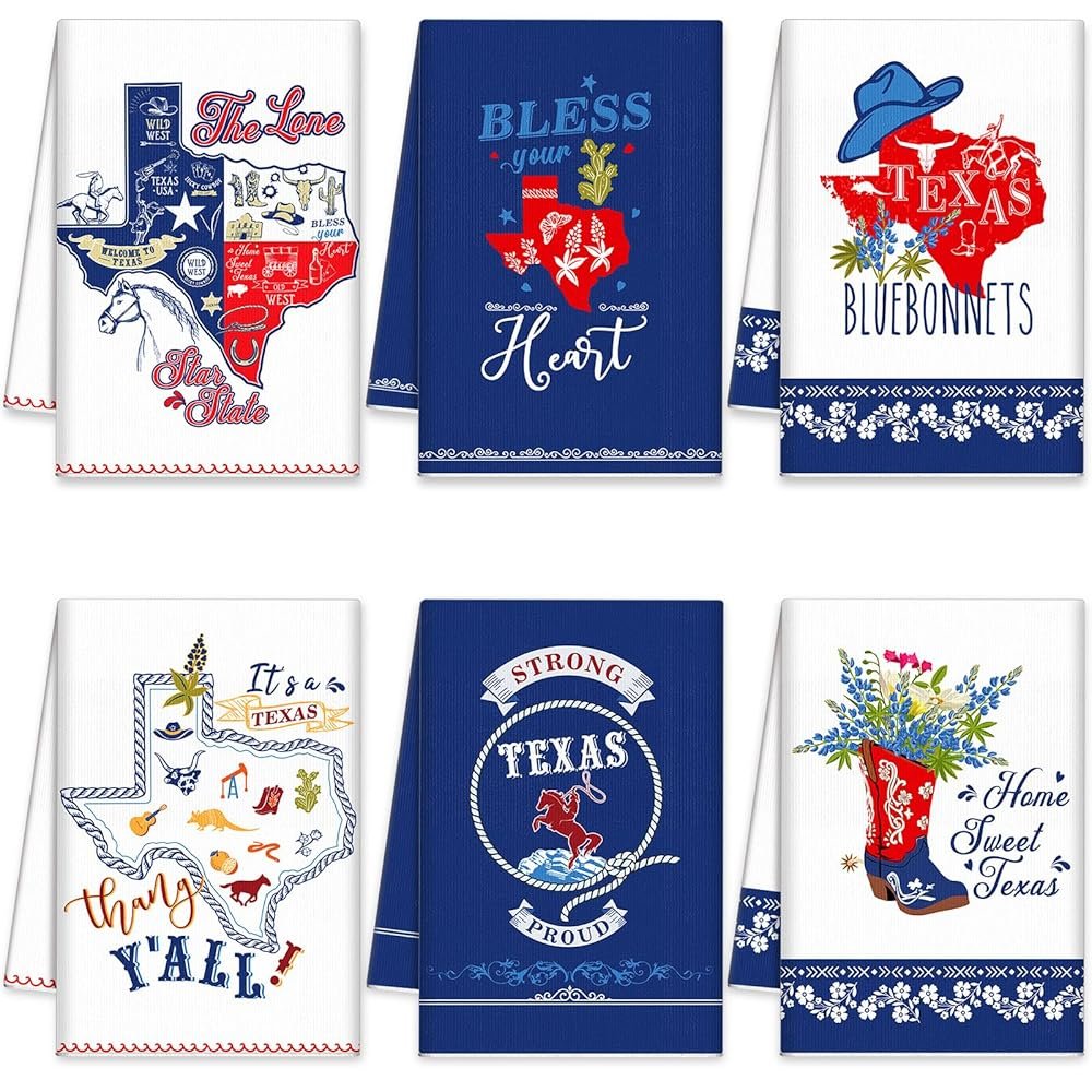 6 Pieces Texas Bluebonnets Kitchen Towels Texas Souvenirs Gifts Sweet Themed Decorative White Blue and Red Print Tea Dish Towel Decor for Home Dish and Hand Drying, 6 Styles