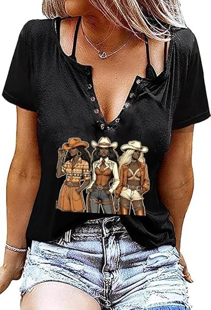 African American Cowgirl V-Neck T-Shirt for Women Black Western Country Texas Rodeo Rock Roll Style Top