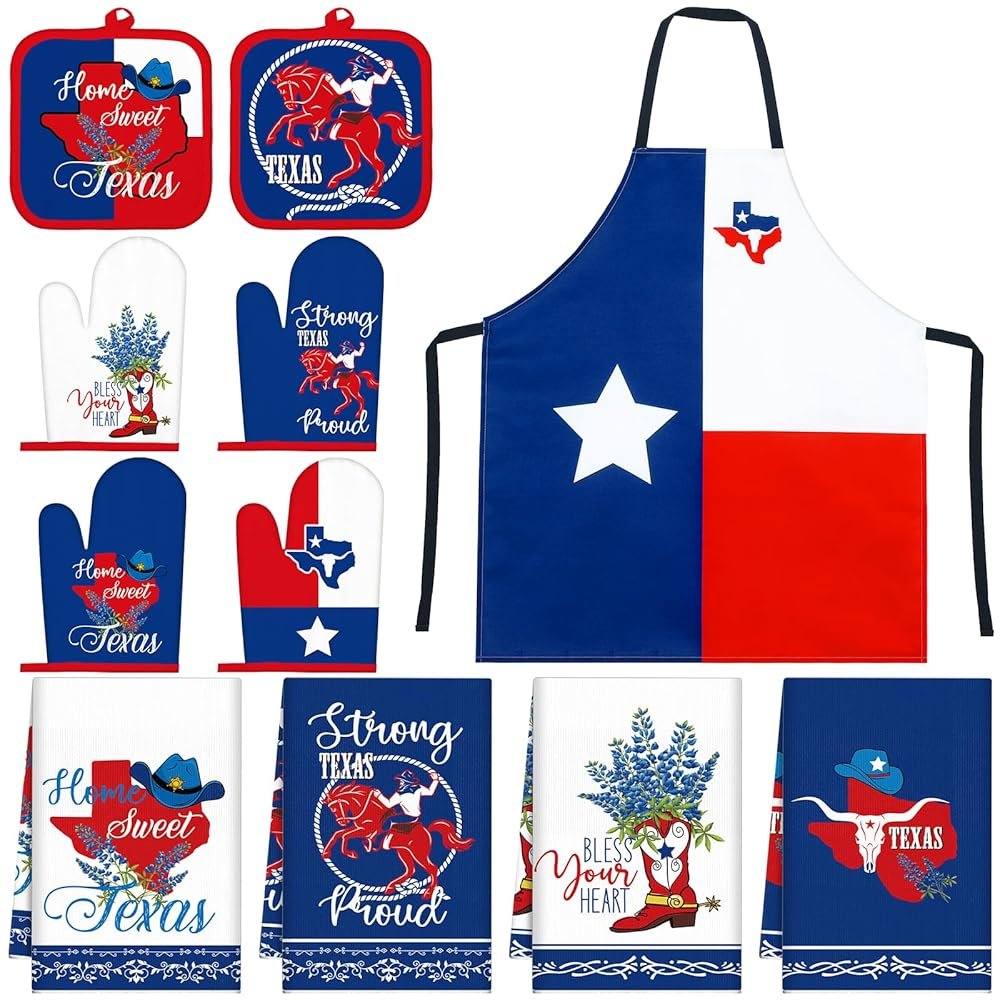 - Texas Bluebonnets Themed Kitchen Set: discover the practicality of your kitchen with our Texas Bluebonnets kitchen towels set; This bundle generously gives you 4 kitchen towels, 2 pot holders, 1 apron, and 4 oven mitts, making this the nice set for handling various cooking efforts; Flaunting a vibrant representation of Texas culture and lifestyle, this set makes for good Texas themed gifts