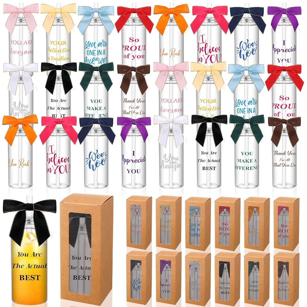 - Employee Appreciation Gift Set: this set includes 24 plastic cups that come with straws and lids; Imprinted with 12 different inspiring messages, these cups are offered in varying colors; Moreover, you can get 24 matching bows and 24 kraft paper cup boxes