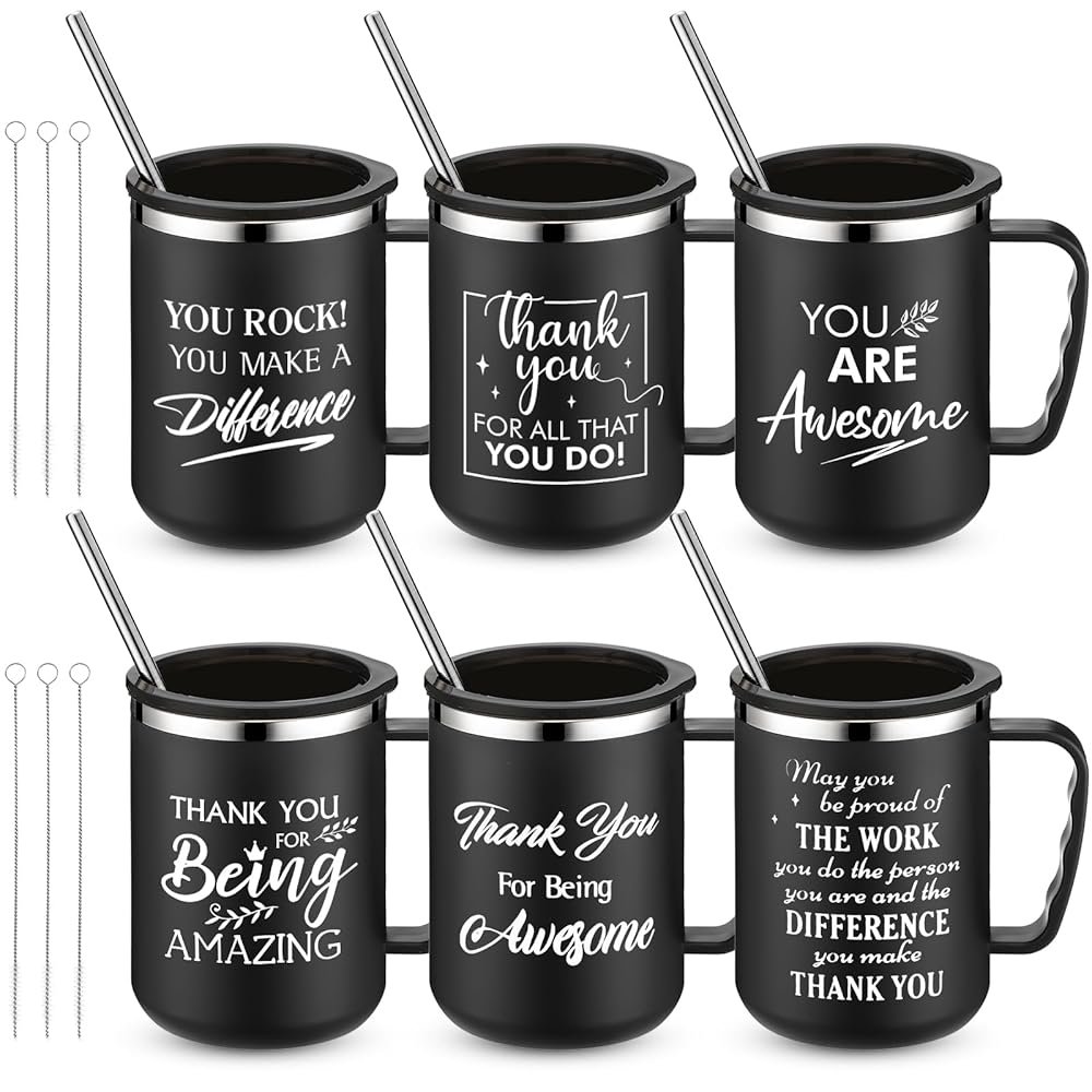 Sumind Employee Inspirational Gifts 17 oz Thank You Stainless Steel Coffee Mugs with Handle Lid Straw for vet tech week gifts(Black,6 Pcs)
