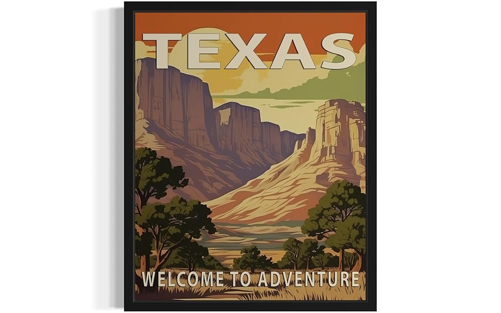 Texas State Scenery Poster Art Print, Retro States Landscape Wall art Decor, Adventure Mountain and Scenery Painting for Bedroom, Living Room 42 (Texas, 8 x 10 inches, Unframed)