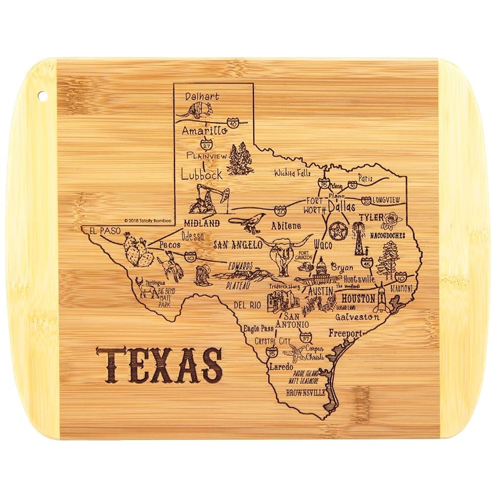 - Savor a slice of The Lone Star State with this beautifully crafted bamboo cutting board that features engraved artwork highlighting the top towns and attractions in Texas