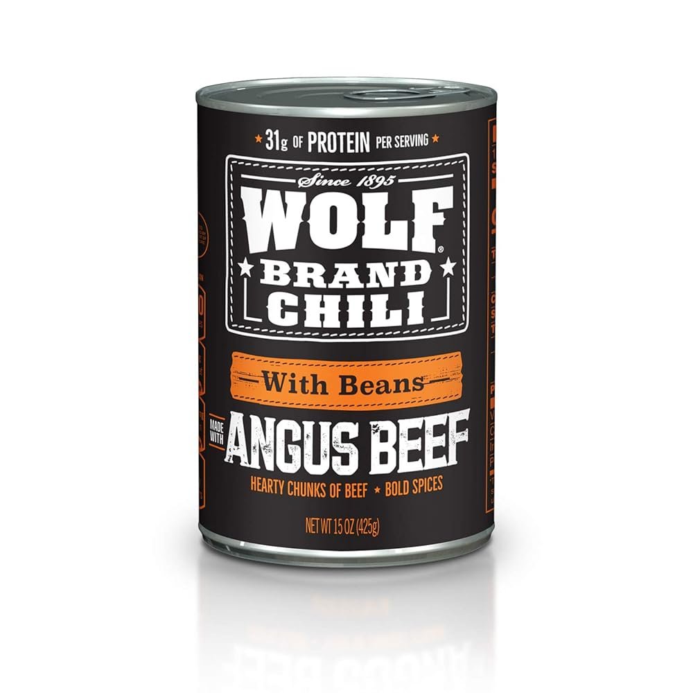 - Contains one 15-ounce can of WOLF BRAND Chili made with Angus Beef and Beans
