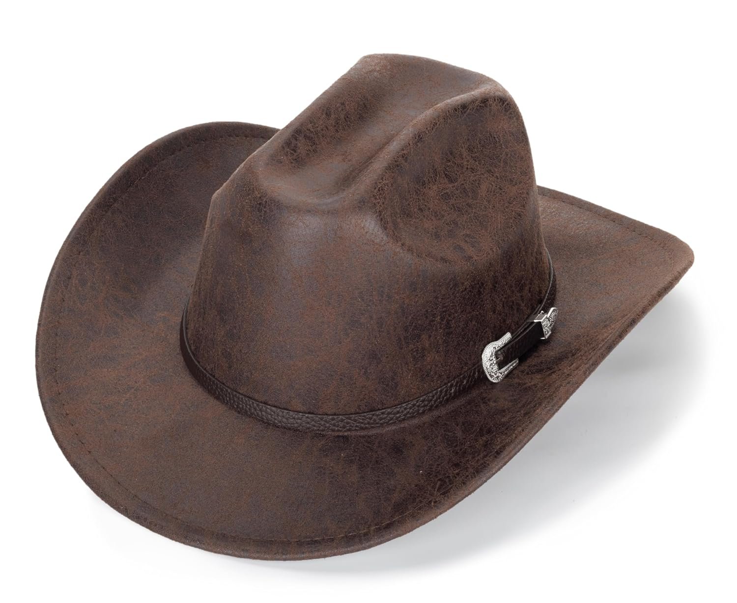- [Classic Western Style Cowboy Hat]-This is a faux leather cowboy hat that complements your western style. The wide brim and vintage buckle make the brown cowboy hat more fashionable.