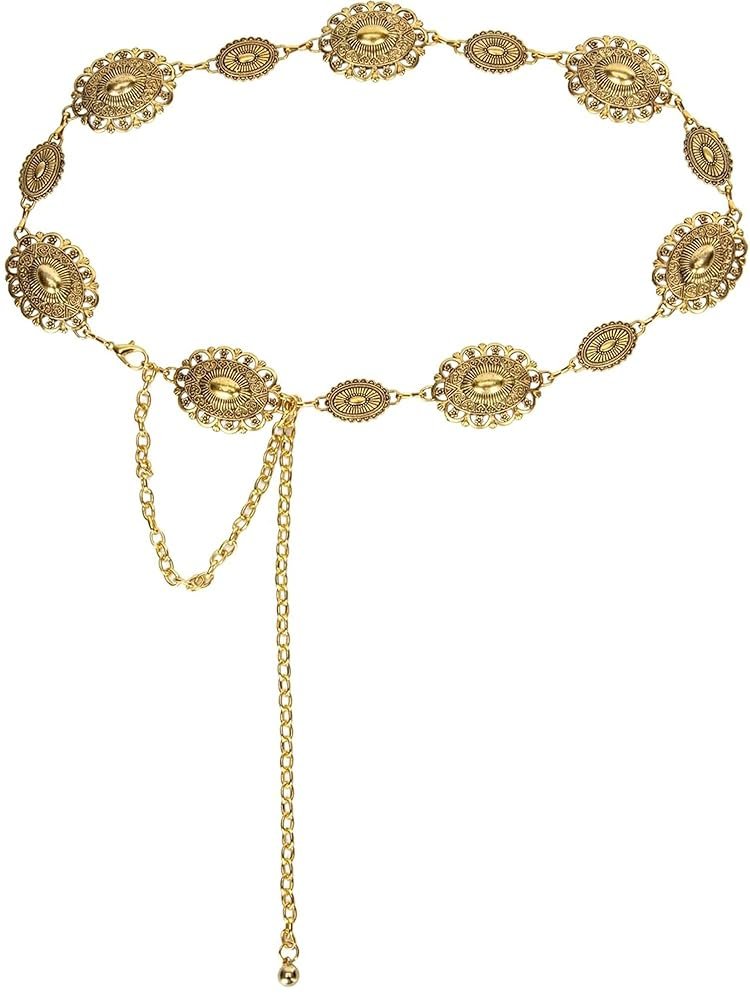 Women Western Gold Chain Concho Belt Cowgirl Cowboy Metal Belts for Dresses Jeans Country Concert Outfits