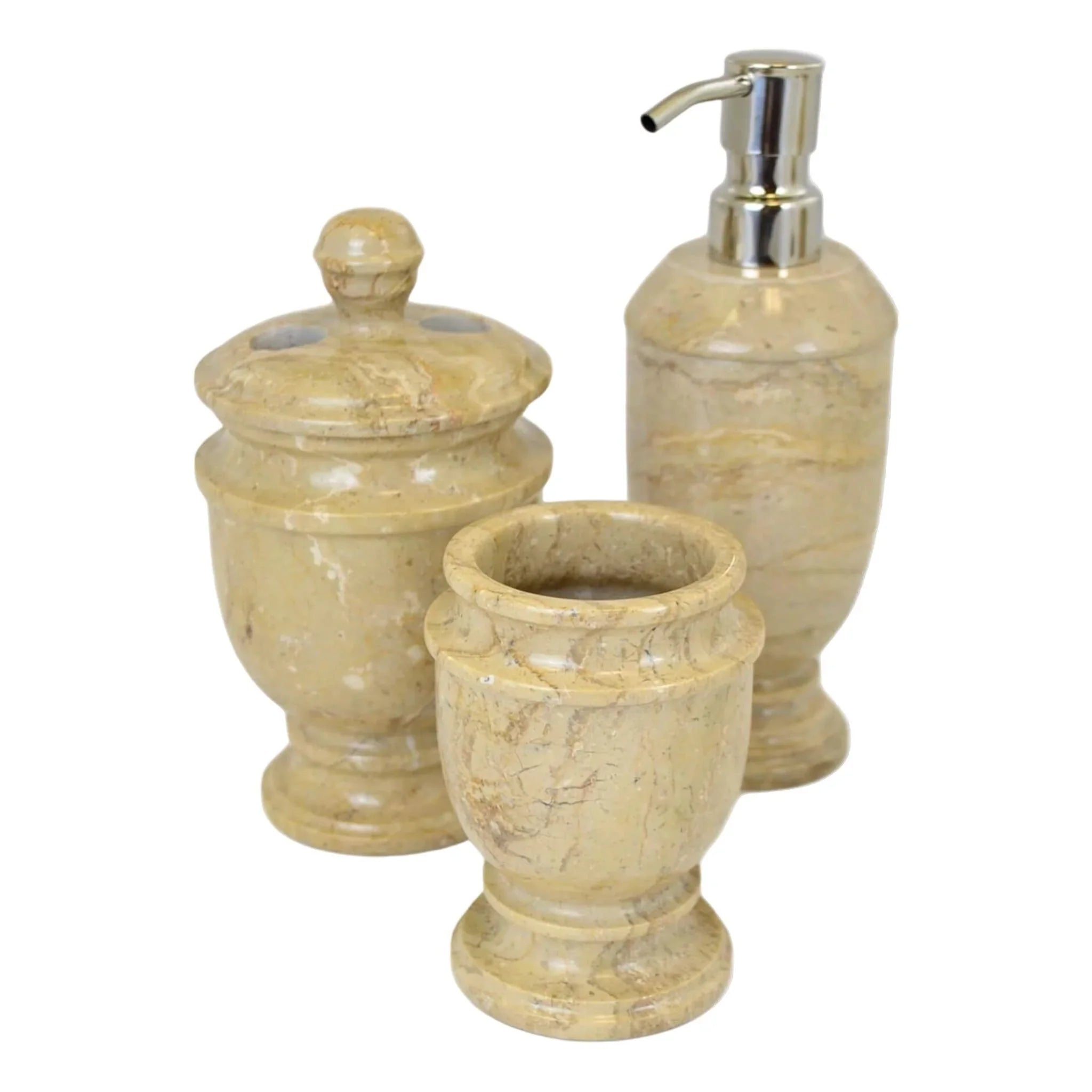 Elevate your bathroom aesthetic with our 3 Piece Bathroom Set. Hand-crafted from Sahara Beige Marble, each unique piece offers a sophisticated, stylish look fit for a luxurious oasis. Transform your bathroom into a world of beauty, elegance and class with our Elegant Bathroom Set. Nature Home Decor brings you the exquisite beauty of natural stone, perfect for adding an air of exclusivity to your home.