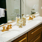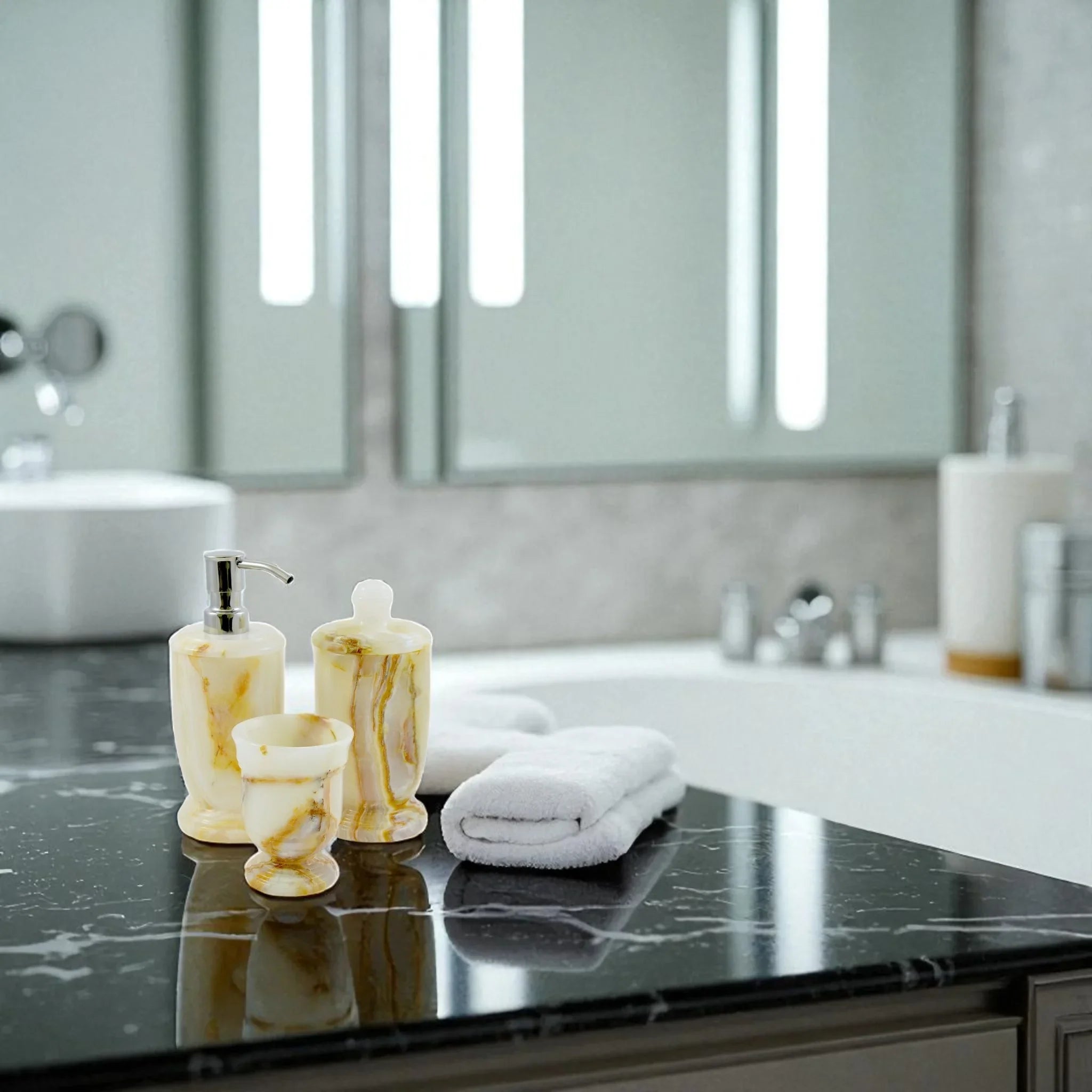 This exquisite 3 Piece Bathroom Vanity Set of White Onyx has been masterfully designed with one of the most translucent Onyx available globally. Nature Home Decor is proud to offer this limited edition Onyx bathroom vanity set that will undoubtedly elevate your personal or guest bathroom decor and garner admiration. Each item of this 3 Piece Bathroom Vanity Set of White Onyx set has been crafted to complement each other perfectly and bring out its natural variations.