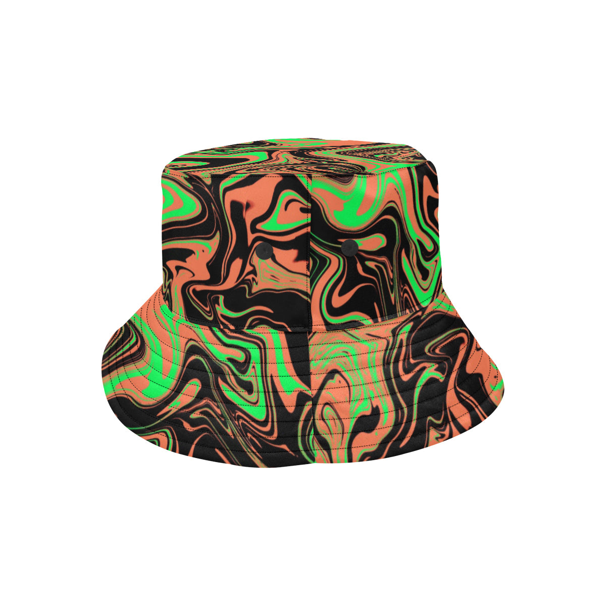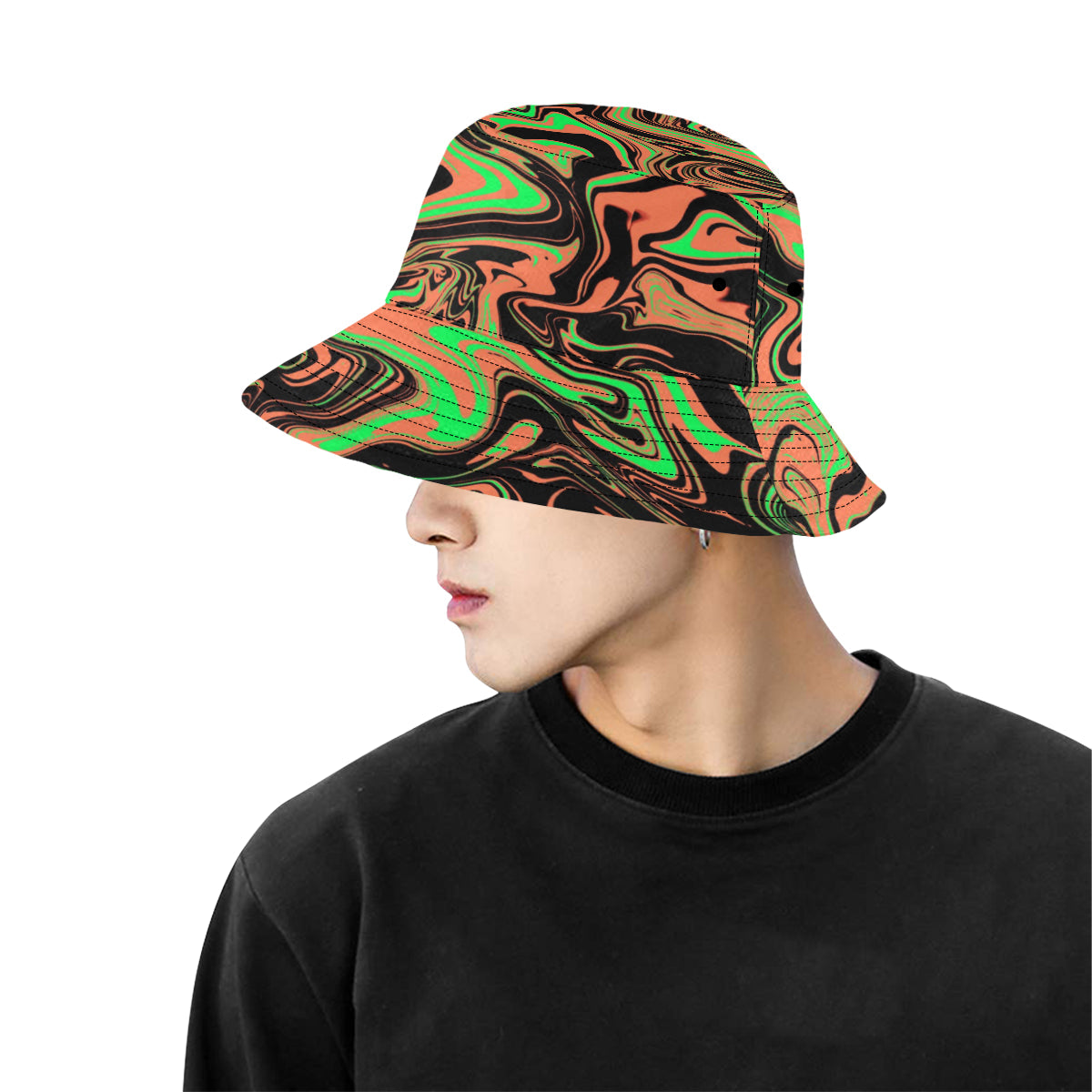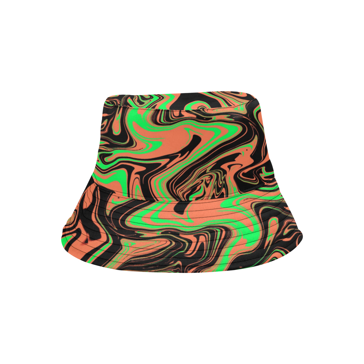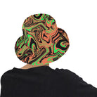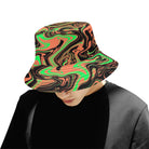 Orange, green and black fluid art inspired all over print psychedelic bucket hat available from BigTexFunkadelic that is reversible; the flip side is solid black. Made from premium cotton, this classic accessory adds another layer of cool to your outfit.