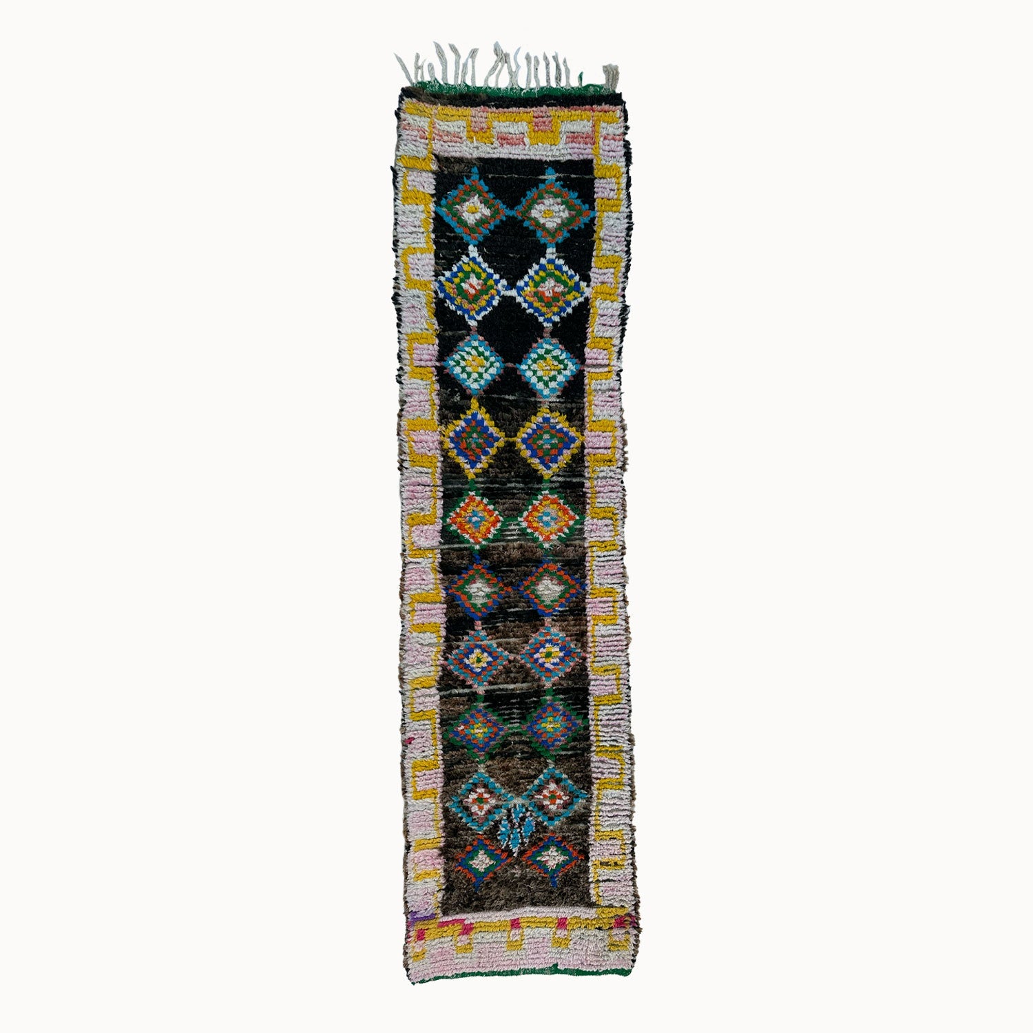 Enhance your space with the Aitbouli Moroccan Runner Rug, measuring 2'8” x 10'4”. This stunning rug incorporates a playful mix of black and multicolor designs, bringing life and character to hallways or narrow spaces. The fringe detail adds a touch of elegance, making it a perfect accent piece.